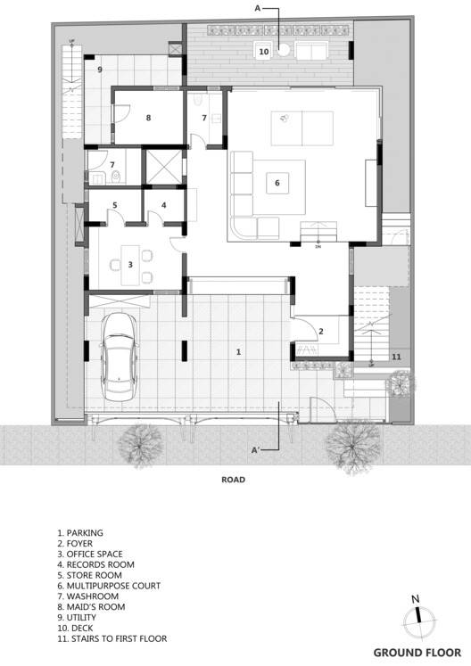 该地点位于班加罗尔一个绿树成荫的郊区,有独立式房屋,朝南,路旁有两棵香肠树。建筑物的定位及其内部分区是由这些树木和场地方向决定的。由于位于东部和西部的两个纵向空间区域,房屋内部和外部之间建立了直接关系。西侧的区域容纳了需要封闭和隐私的程序,而东侧的区域主要是开放的,允许从房屋后部到前部的轴向连接。东部区域被分段调整,以允许房屋各层之间的横向连接。