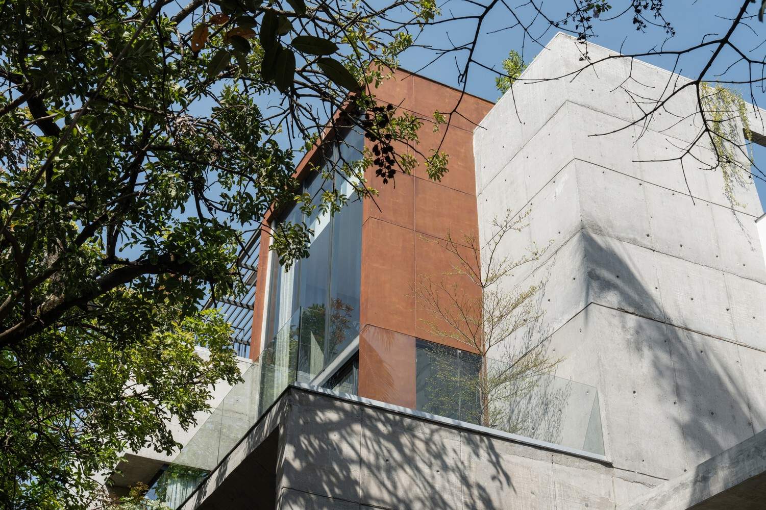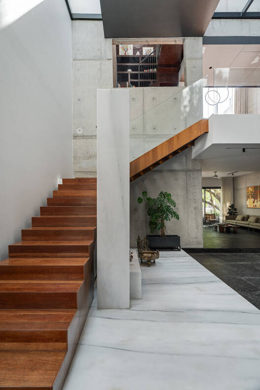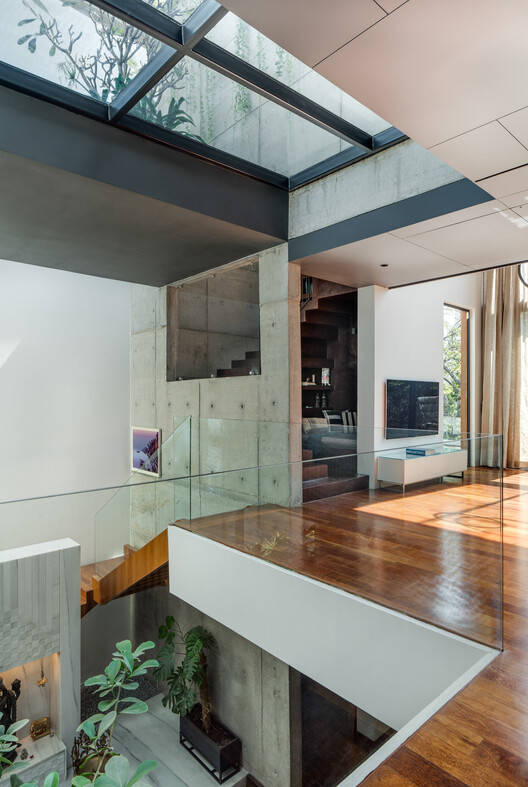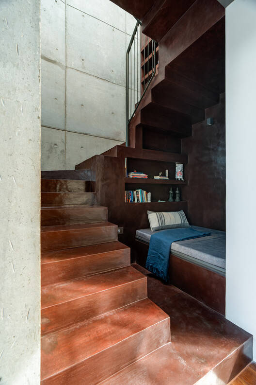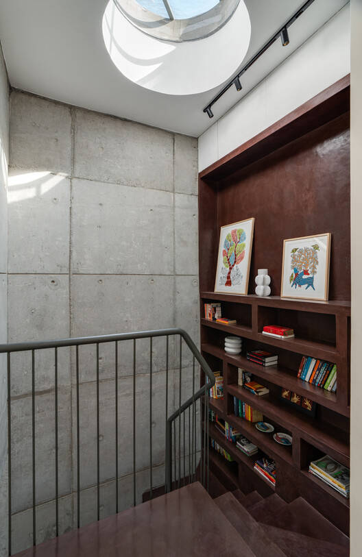 The second floor is accessed by a metal staircase wrapped in wood. The wood floor expands throughout the spaces on the second floor which provides a tactile base sympathetic to the natural materiality of the concrete wall and the wood-paneled walls. This level has a large double-height aperture on the south framing the lush foliage formed by the 2 trees and the sky. This expansive space is contrasted by a spiral staircase with habitable voids carved in poche. The contrast is further heightened by the red oxide flooring that spills over from the terrace level to the floor below. Towards the northern side of the expansive space is the courtyard void connecting to the floor below and a walkable skylight glass connecting to the terrace above. Another aperture towards the east diagonally connects the family room to the street below.