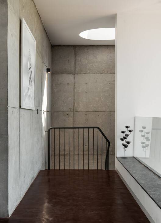 二楼有一个用木头包裹的金属楼梯。木地板延伸到二楼的整个空间,提供了一个与混凝土墙和木镶板墙的自然材料相呼应的触觉基础。这层楼的南面有一个巨大的双层高的光圈,将两棵树和天空形成的郁郁葱葱的树叶框起来。这个广阔的空间与螺旋楼梯形成对比,螺旋楼梯上雕刻着可居住的空隙。从露台层溢出到下面地板的红色氧化物地板进一步加剧了对比。在宽敞空间的北侧,是连接下方地板的庭院空隙和连接上方露台的可步行天窗玻璃。向东的另一个开口将家庭活动室与下面的街道对角线连接起来。