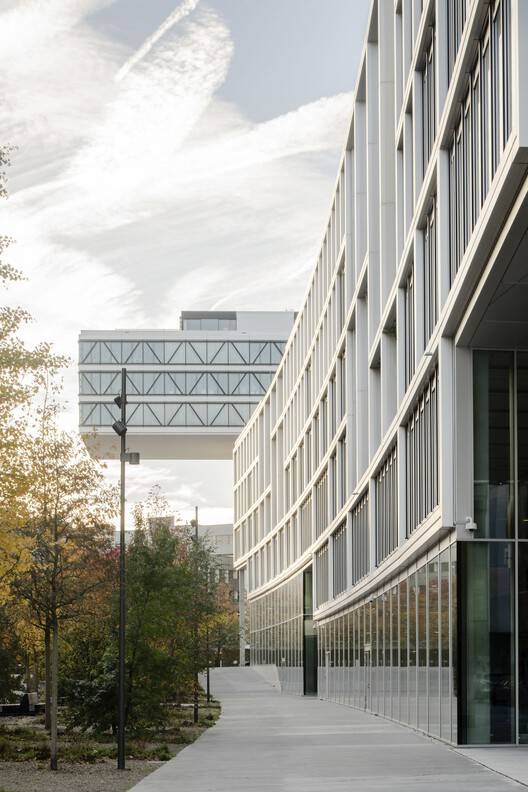 建筑的上部由四层办公楼组成,呈锯齿形布局,开放灵活的办公景观围绕一系列不同高度的外部绿色庭院形成内环。在内部,三个核心在办公楼层之间和建筑底部之间建立了连接。