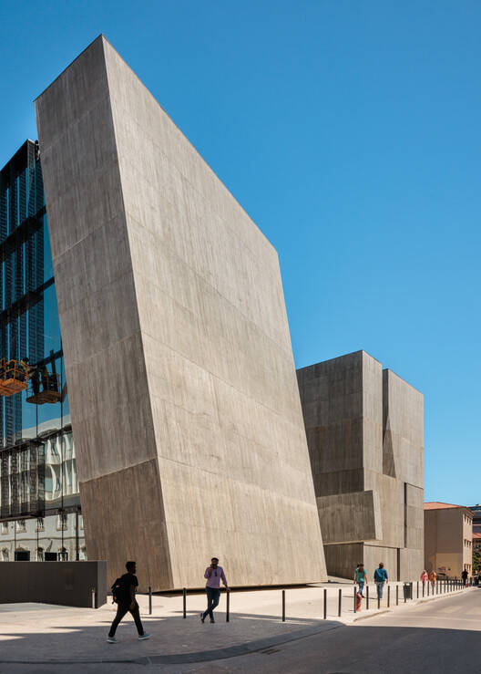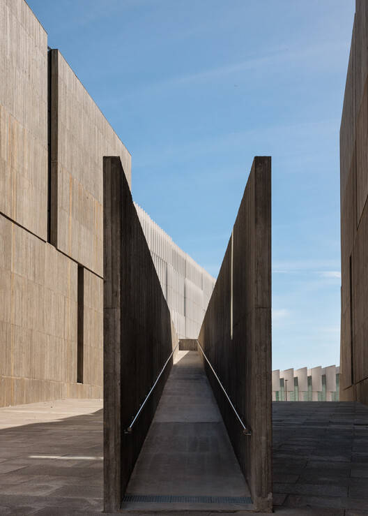 Text description provided by the architects. This project had to solve a kind of paradox, two forces pulling in opposite directions: on the one hand, it had to comply with a Masterplan that required continuity of the public space from the hills to the river (north-south direction) resulting in a splitting of the building's mass into two linear volumes. On the other hand, the building had to function as one single entity; so the 2 linear volumes had to be connected in the east-west direction threatening the north-south continuity of the public space. So, to respond to both forces simultaneously, we folded the ground of the public space with a slight slope that complied with the hill-river continuity and then connected the two linear volumes under the highest point of the folded ground.