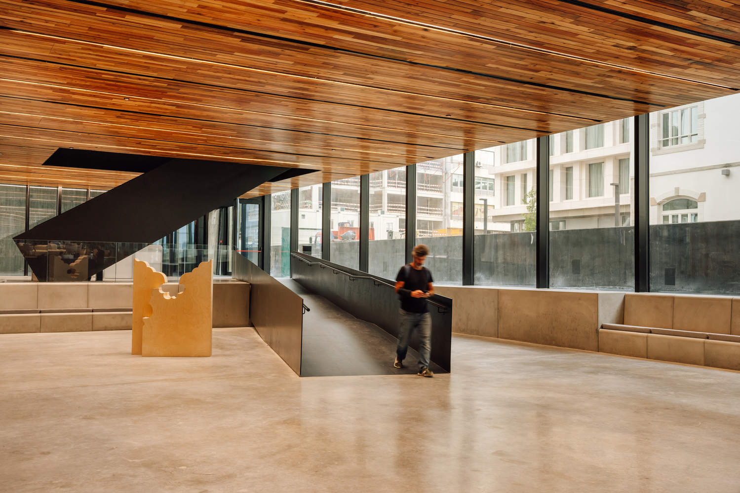 空间与功能的巧妙融合:该项目最引人注目的亮点在于其对场地限制和城市肌理的回应。建筑师巧妙地利用了场地高差,塑造了一个倾斜的公共广场,不仅解决了场地与河流之间的视觉阻隔问题,更创造了连续的公共空间。这种设计策略打破了传统建筑与城市之间的界限,将建筑体量与周围环境有机地结合起来。同时,通过将入口设置在广场的南侧,避免了将建筑过度商业化,保证了公共空间的开放性和可达性,体现了对公众的尊重和对城市环境的积极贡献。这种对空间和功能的精妙平衡是该项目成功的关键。