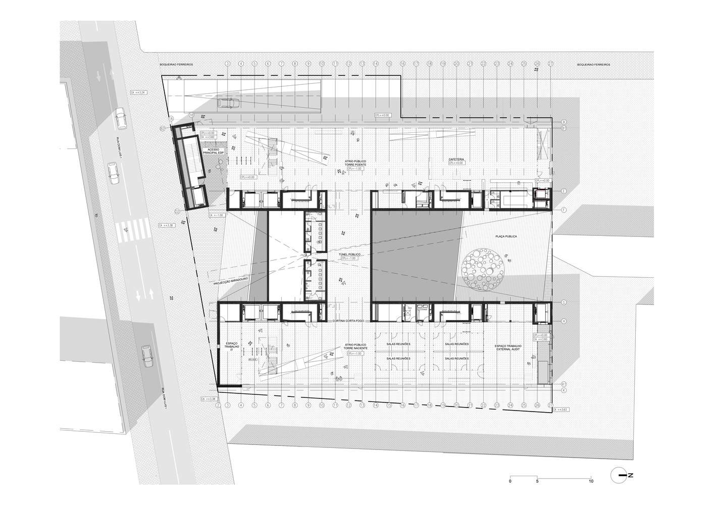 This artificial sloping ground offered the opportunity to solve another issue of the lot: being on the second row of Lisbon's urban grid, the visual continuity towards the river was more theoretical than real. The building of EDP across the street, even though as a general mass complied with the north-south continuity, at the pedestrian level blocked any perception of the river. We laid a piece that rested on the slope, cantilevered towards the river, gaining enough height to lean over the adjacent building, achieving a clear view of the Tajo. So, the square at the core of the complex is exclusively public.