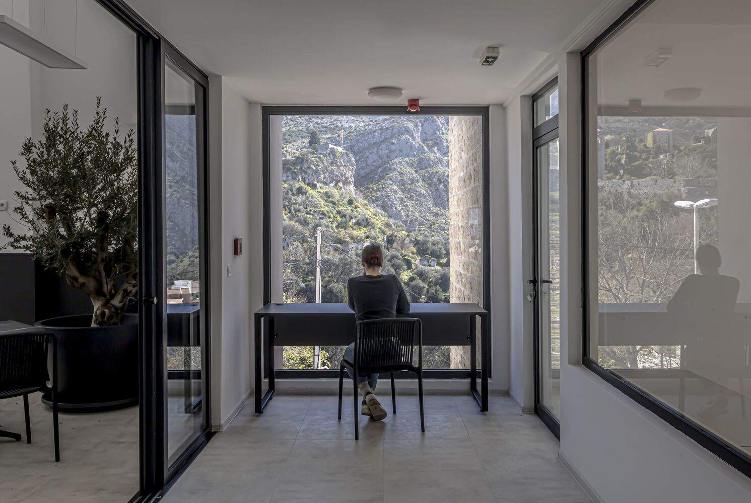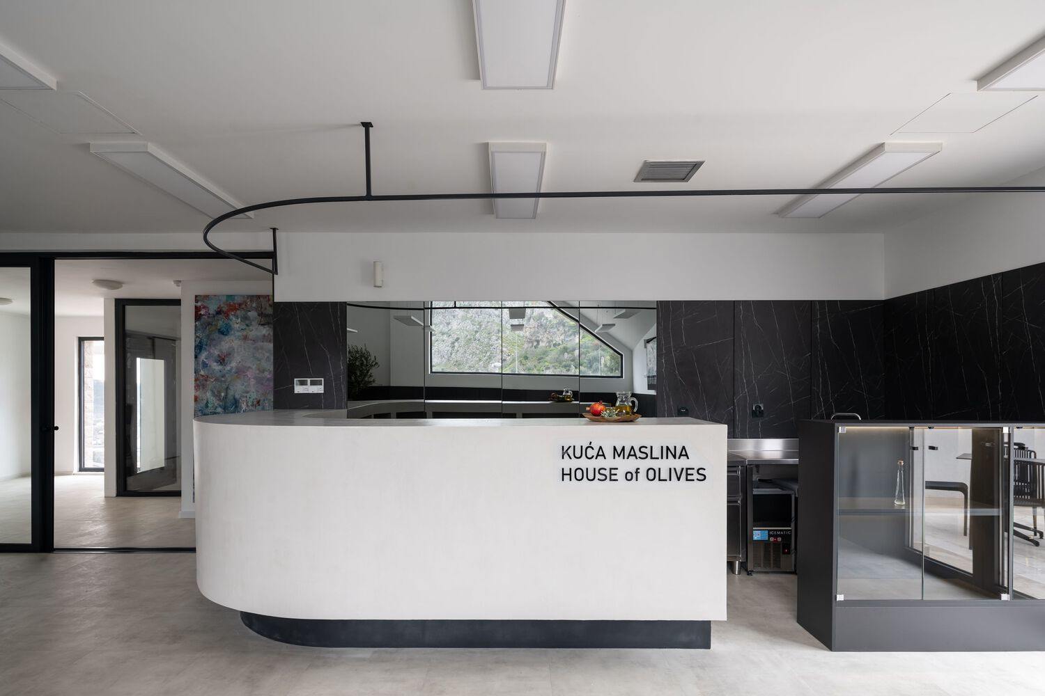 Space for education and administration - On the first floor of the building, in accordance with the project task, there is a multifunctional hall intended for permanent education and seminars for all olive growers of Montenegro. The capacity of the hall is 80 visitors. It is related to the administrative part, which consists of three offices for permanent employees. Next to this block there is a kitchenette and a bathroom. Given the educational function of the facility and the openness of the facility to visitors, there is no strict division of zones for work, education and visits. The inspiration for the interior design of the House of Olives was found in the immediate surroundings of Old Town Bar, but with the aim of offering a modern interpretation of traditional elements, such as stone, arch and olive trees. They become the main motifs in the interior of the building. The main experience upon entering are the views that extend towards Old Town Bar, the cultural and architectural heritage of the city of Bar.
