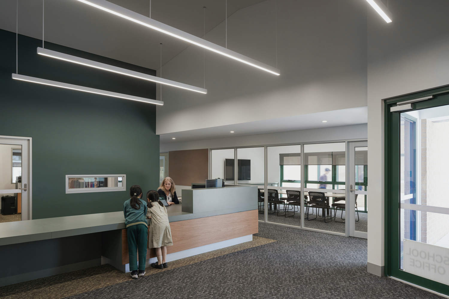 进入学校是以风车配置组织的,优先考虑的是寻路。新的家庭和游客需要能够在入口处直观地导航——接待处、图书馆、中央运动庭院、会议室。视图是精心编排的;图书馆通过大道与行政区和接待处相连,通往公共场所的天窗将人们的视线引向蒙哥马利大道旁的成熟树木。