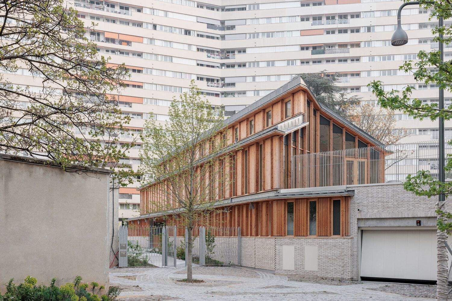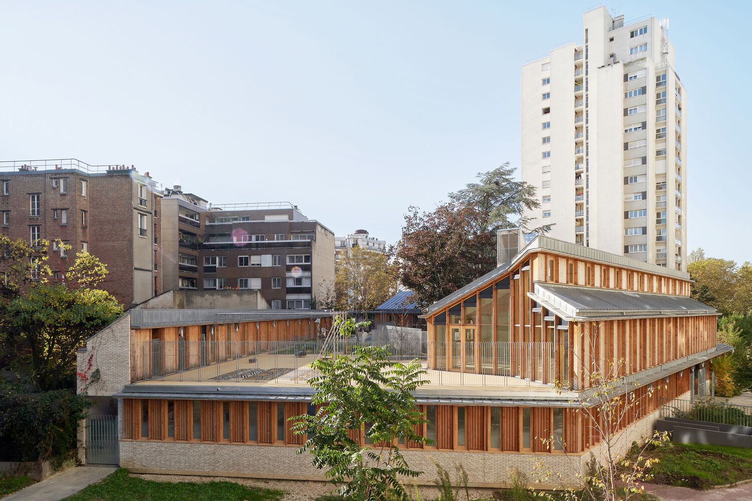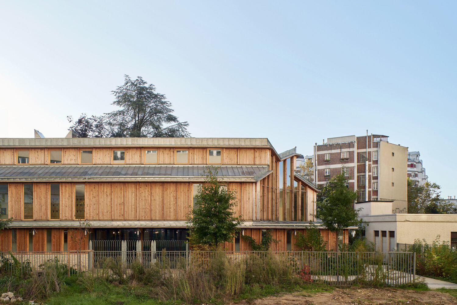 Above its white brick base, the building is entirely made of wood. The shed-shaped, zinc-covered roofs collect rainwater in the garden and provide natural ventilation for the reception units and secure over-ventilation at night. The generously glazed facades, clad in vertical wood cladding, reveal the structural framework through their spines. Two white brick chimneys indicate the superposition of the publics facilities with the residence's preserved underground parking lot and the integrated redesign of its access.