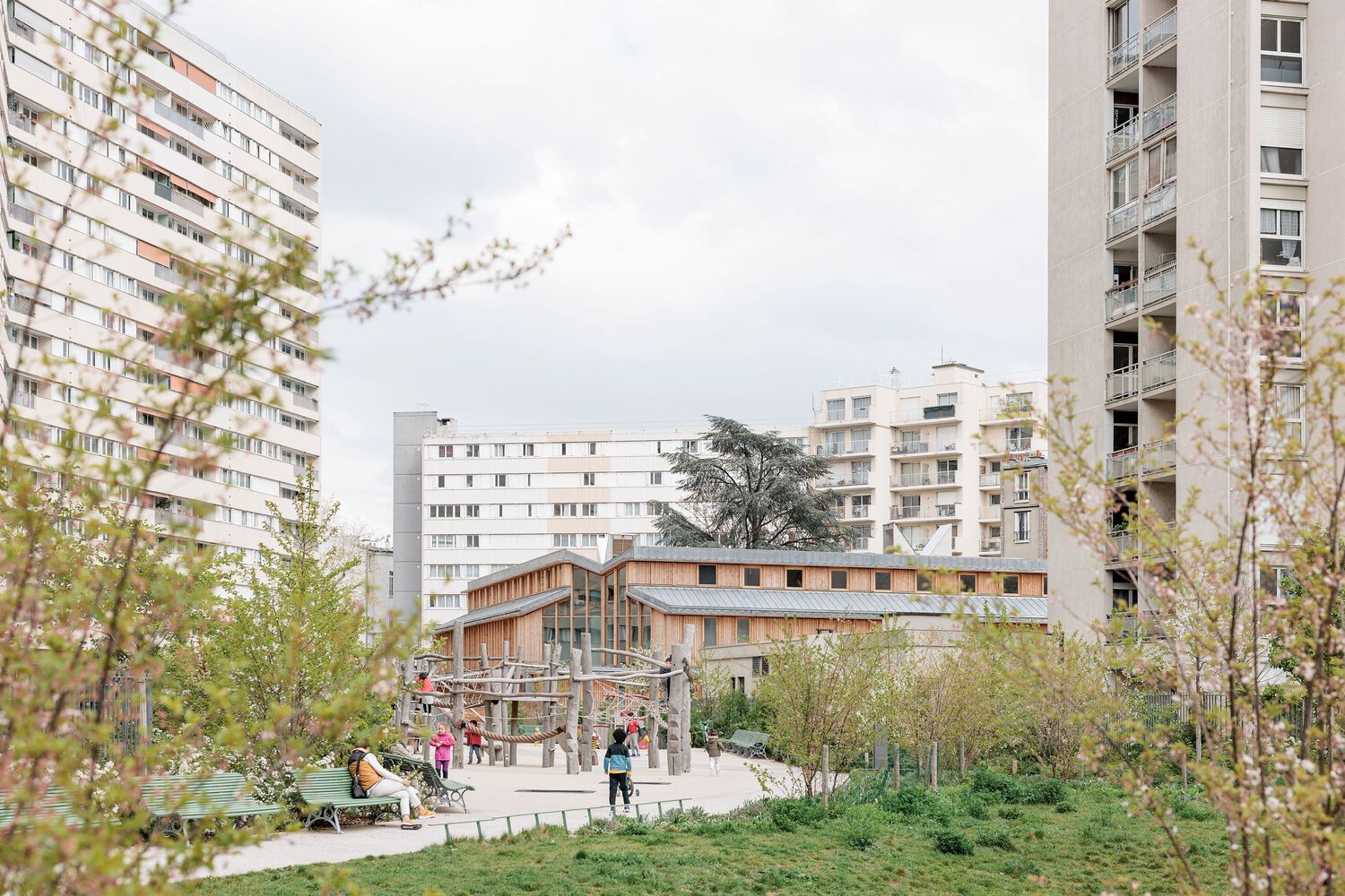 Text description provided by the architects. Connected to the new public garden, the Périchaux toddler center with its new square and alleyway, will help requalify the Lefebvre-Périchaux-Brancion residential complex and enhance its landscaped open spaces. While the external geometry of the building sequences the public spaces and their perspectives from Boulevard Lefebvre towards the heart of the block, its internal geometry creates a protected interior garden in this dense environment of high-rise buildings.