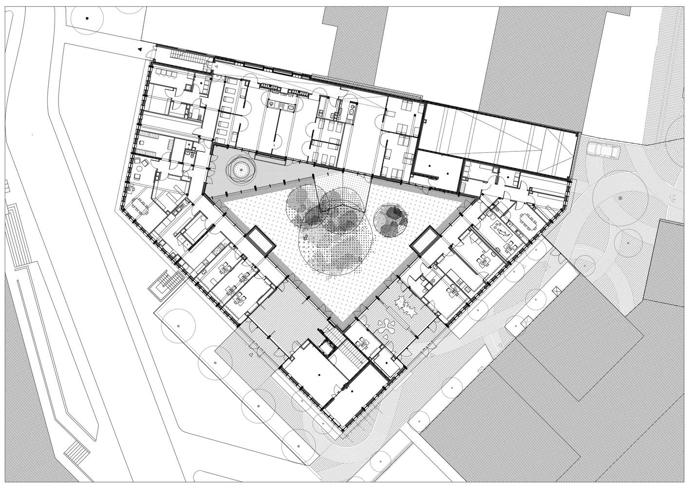 围绕着钻石形的花园,这座建筑形成了一个回廊,由一个倾斜的人物组成,在一楼达到顶峰,一楼有一个低翼,背对着派对墙。在西角的两侧,日托和妇幼保健中心这两个设施对称地与住宅和城镇相连。这些设施的步入式大厅从公共空间到室内花园都营造出一种深度和透明度。阁楼弯曲一个角度,以显示两个公共空间的连续性。