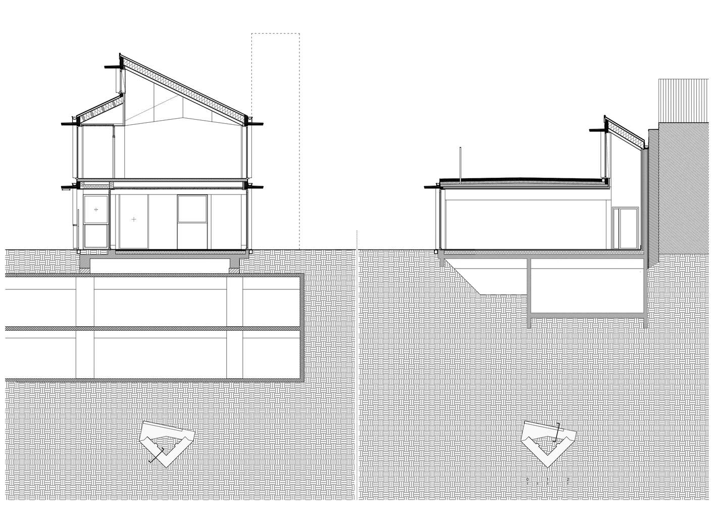 这座建筑的白色砖基之上完全由木材建造。棚屋形状的锌覆盖屋顶收集花园中的雨水,为接待单元提供自然通风,并在夜间确保过度通风。宽大的玻璃幕墙,覆盖着垂直的木质覆层,通过它们的刺揭示了结构框架。两个白色砖烟囱表明公共设施与住宅保留的地下停车场的叠加,以及对其通道的综合重新设计。