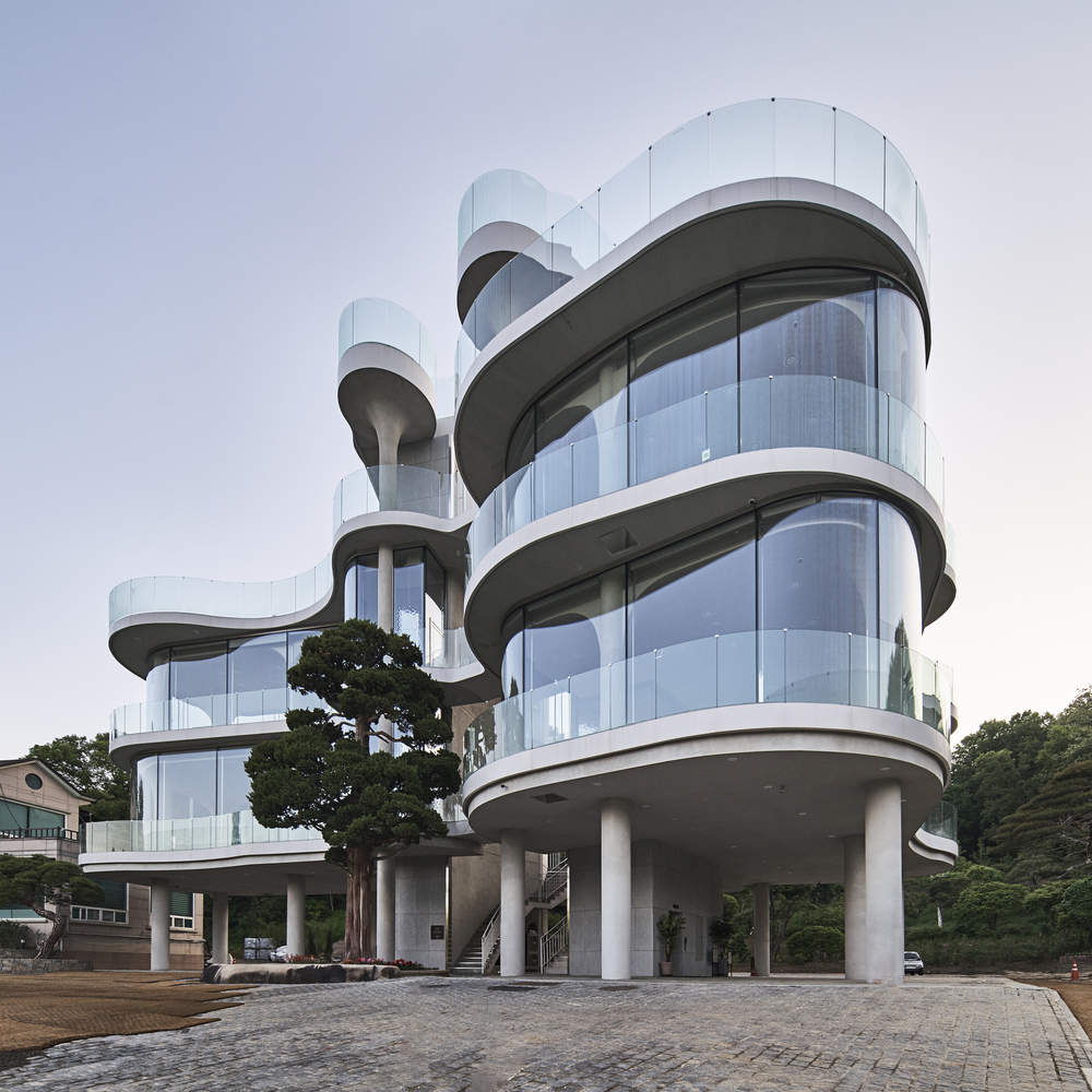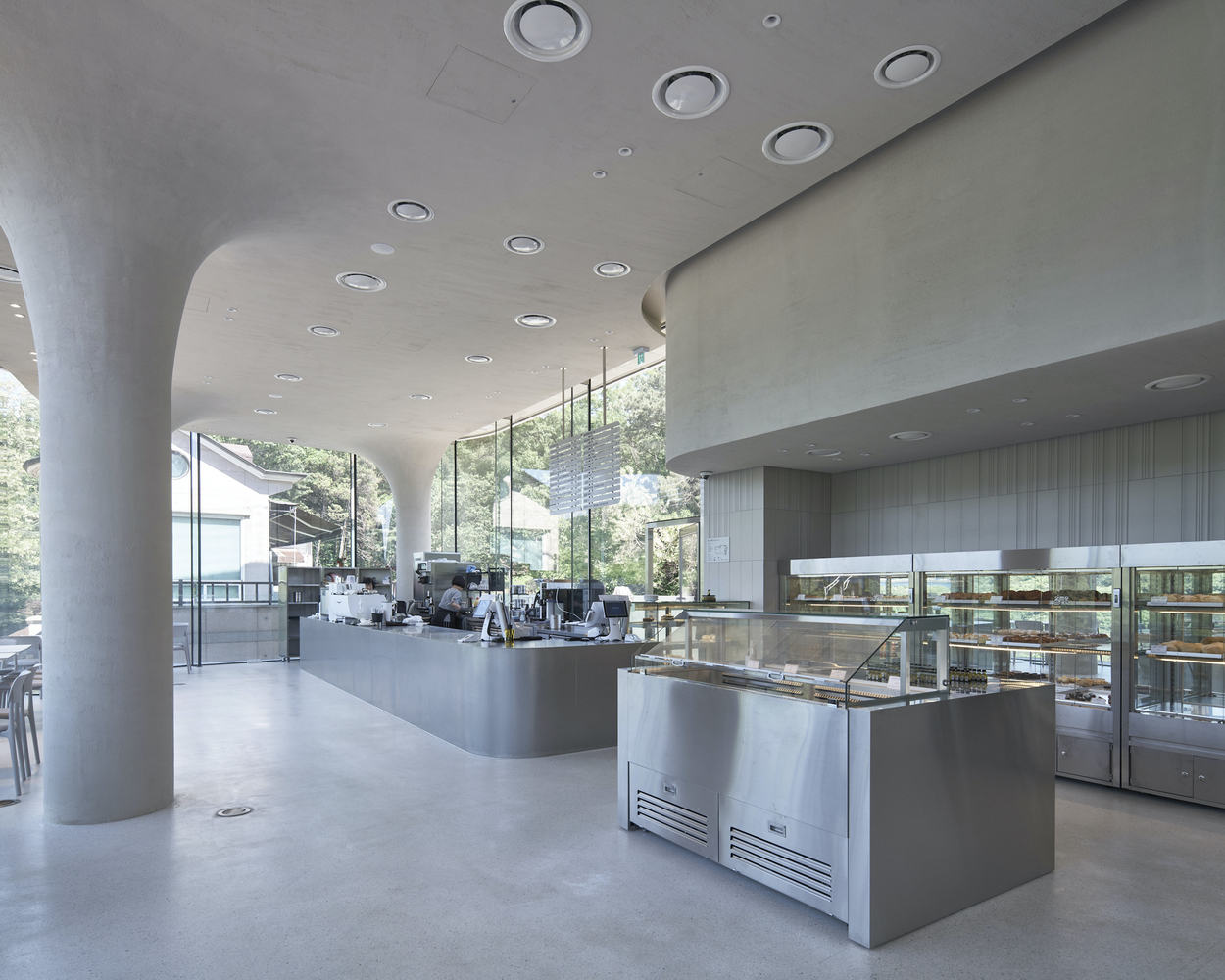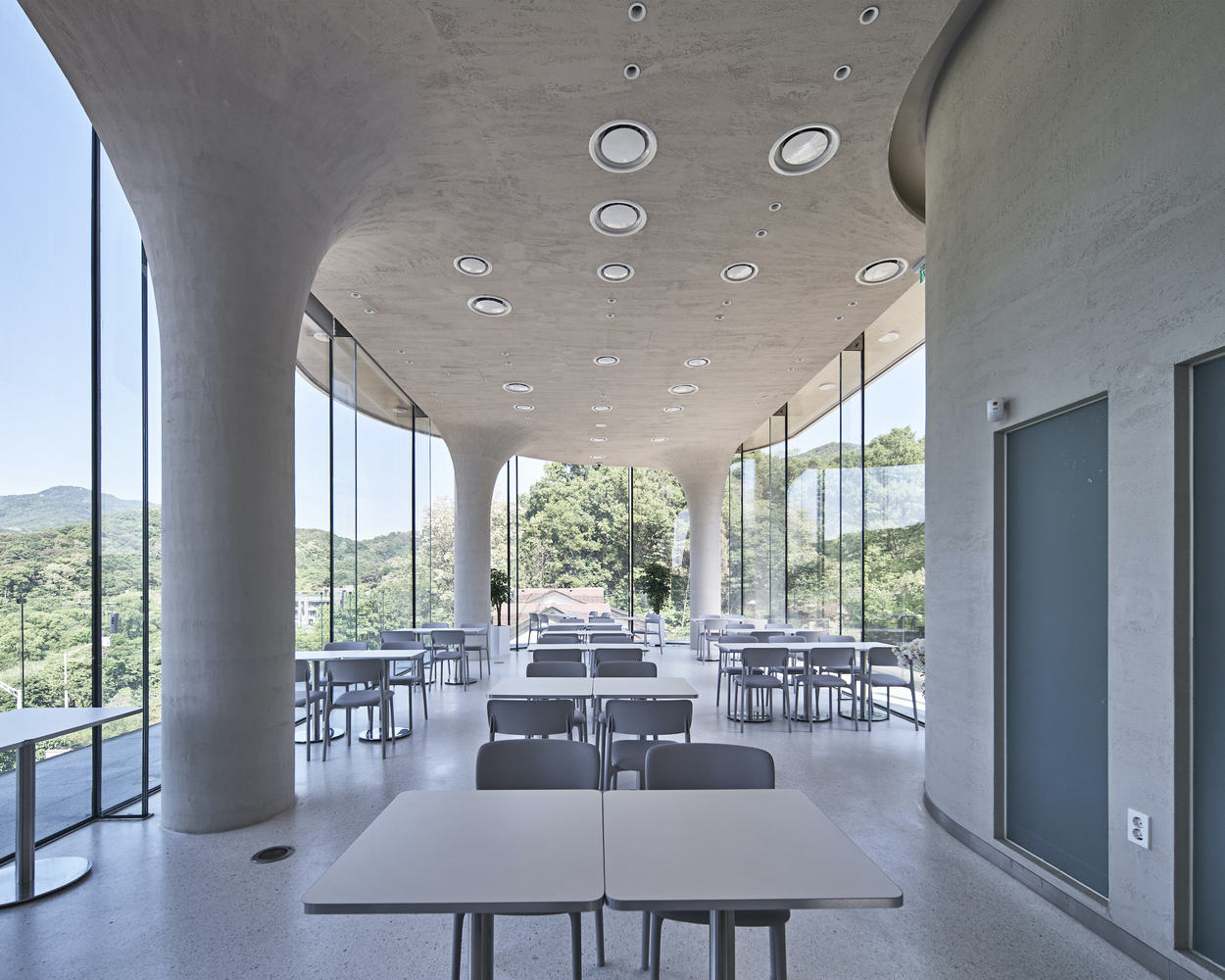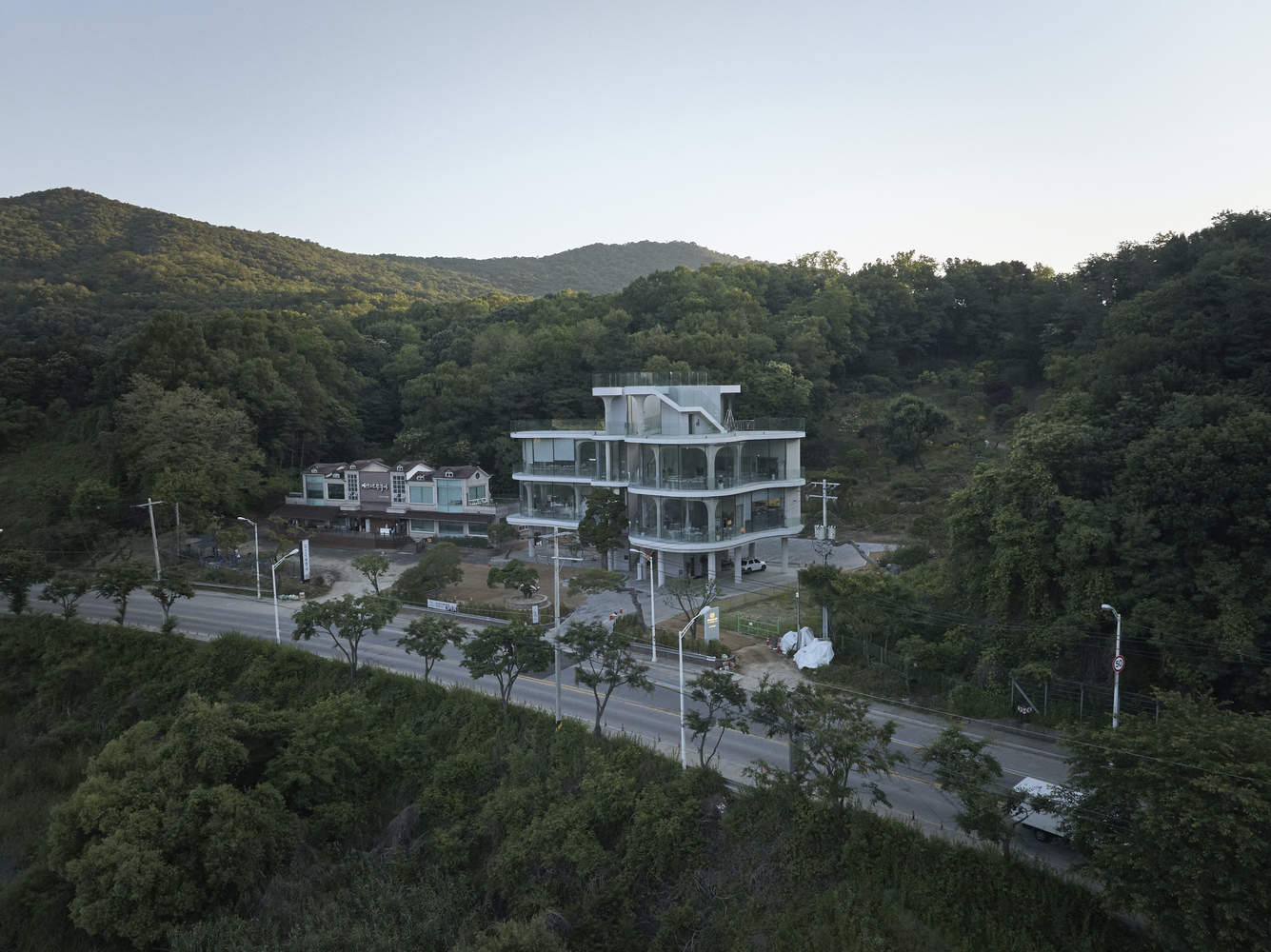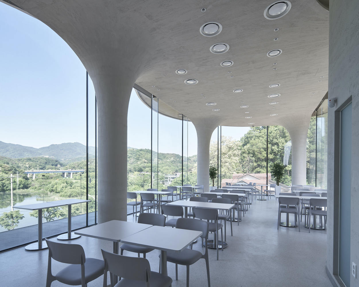 Each space was planned to be as exposed as possible to the view of the Daewang Reservoir in front of the building and the forest of Inreungsan Mountain in the back. In order to maximize the space's intrusion into the nature of the front and back, the size of the surface facing the view was maximized through the curve of the façade, and the space was created to create a spatial effect like a pavilion that naturally intrudes into nature.