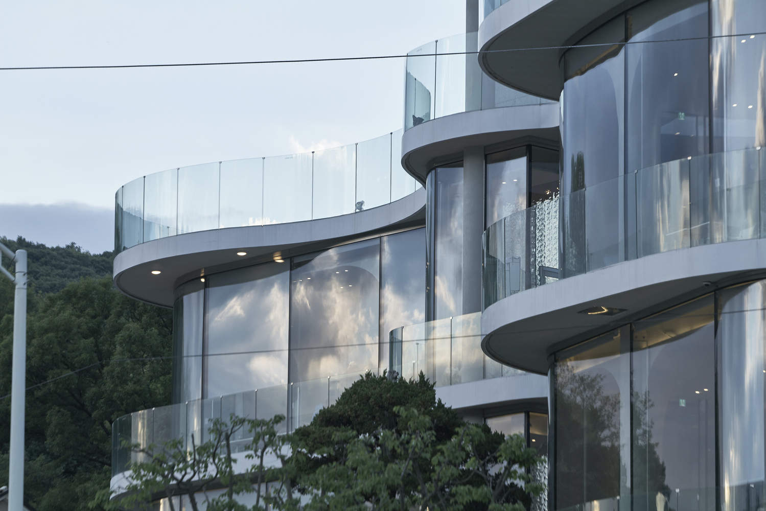 The view frames of the secondary view formed in this way are structured in the form of a curved ceiling that matches the exterior of the building and a pillar with the ceiling flowing down. It is a curved surface on the elevation along with a curve on the plane and is a curved surface without changes in interior and exterior materials. A single internal space shape was created.