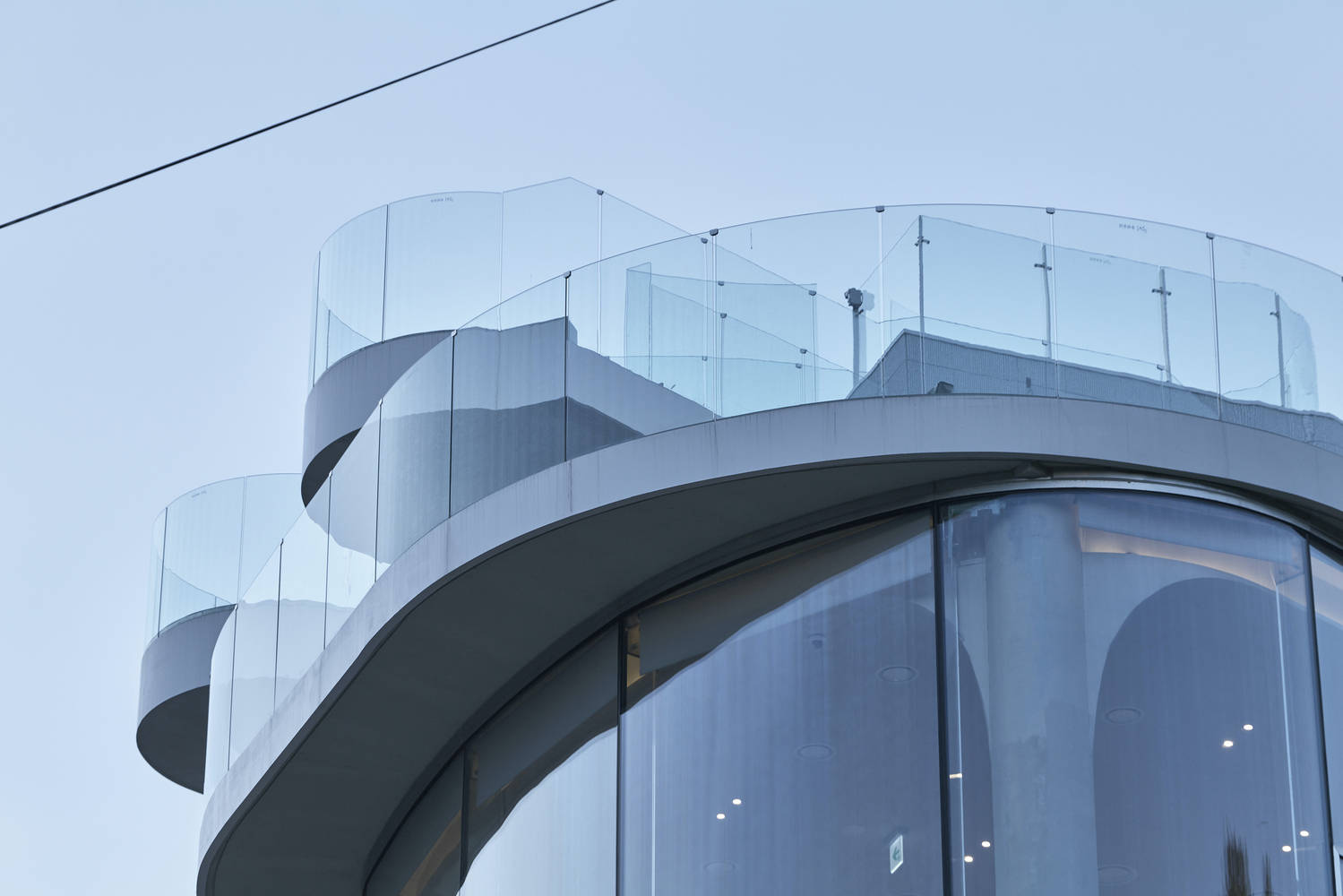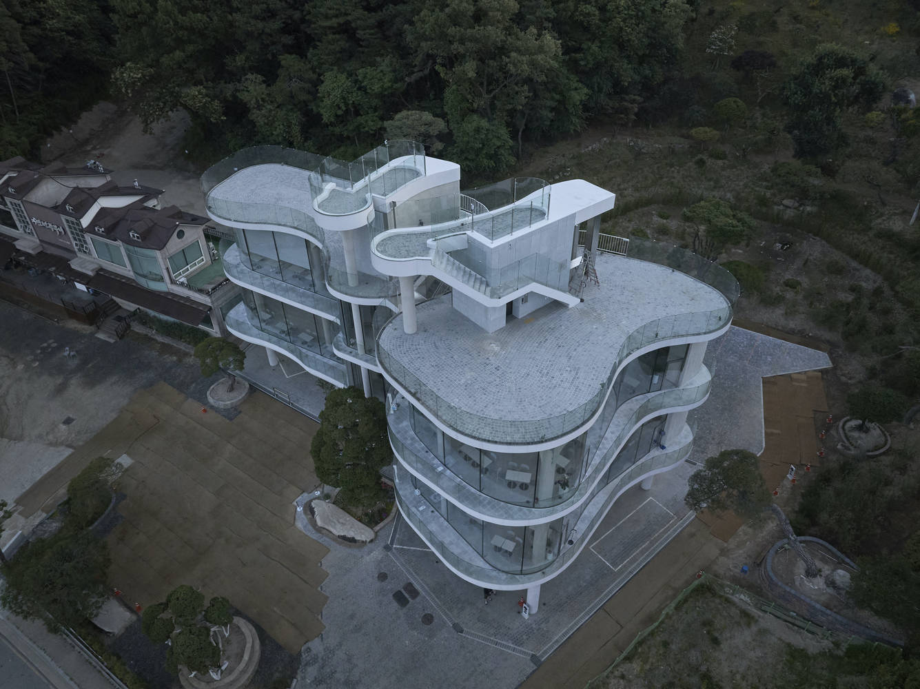 The exterior of the Rosemary Cafe is an extension of the interior space, with three layers of curved balconies stacked on top of each other. It is a feature of the site located between nature, where the architectural context of the city is not connected, and the curved Daewang Reservoir and the sky of Cheonggyesan Mountain and Inreungsan Mountain. Between the lines created by the lines, we attempted to adapt them to the land context by borrowing the crystal glass curtain wall that reflects the transparent characteristics of water and the motif of layered fog clouds over the mountains.