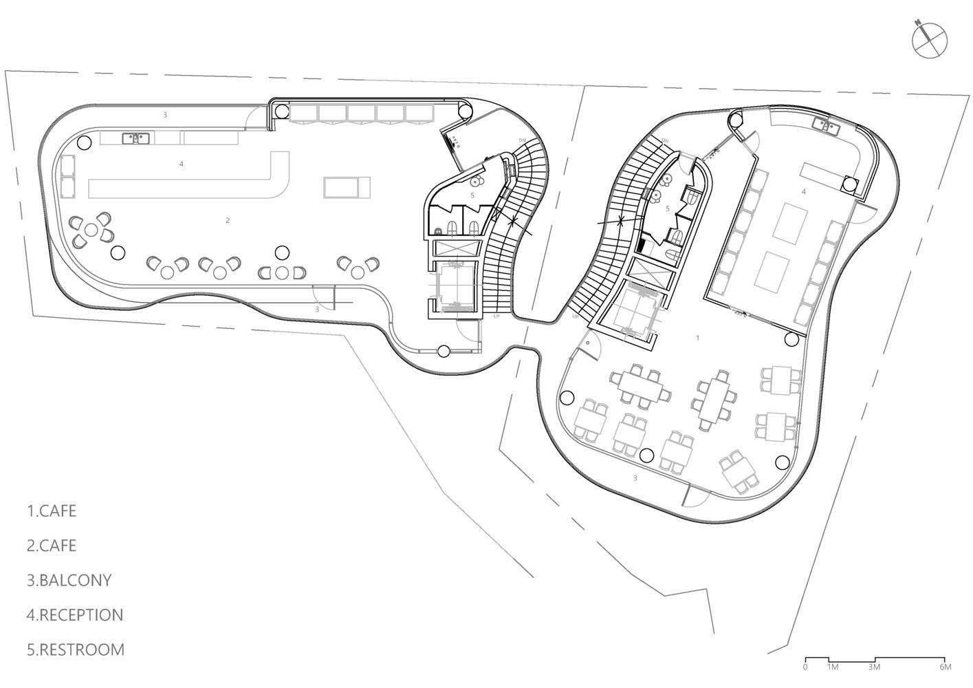 与自然的对话与融合: 该项目在与自然的对话上展现了极高的造诣。咖啡馆的每个空间都力求最大程度地拥抱周围的自然景观,面向大旺水库和茵仁三山森林。建筑师通过立面曲线的设计,最大化了观景面,创造了类似亭子的空间效果,将建筑与自然融为一体。这种设计手法使得室内外空间相互渗透,模糊了边界,让人们在咖啡馆内就能感受到大自然的魅力。此外,弯曲的阳台和水晶玻璃幕墙的应用,进一步增强了建筑与环境的互动,使建筑成为自然的一部分,而非突兀的存在。