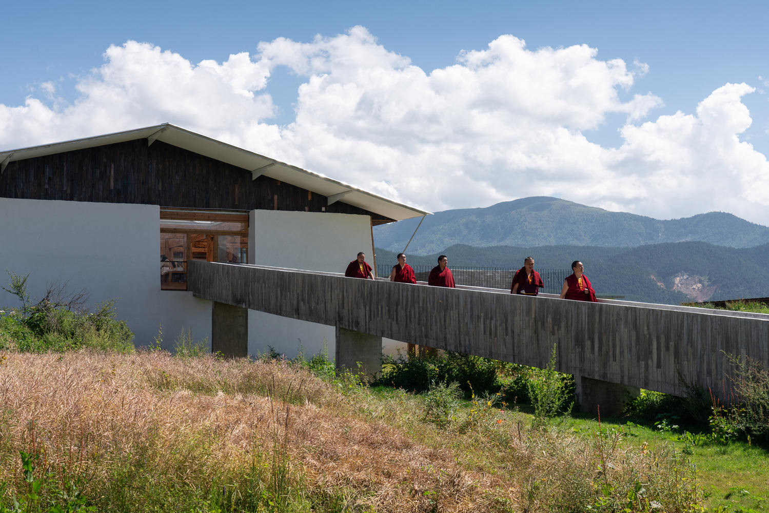 为了避免侵占农田,书店的走廊向外延伸,然后向后弯曲,停在庭院门口。然后,它沿着山脊向南延伸到一个室外平台。这里原本有一堵矮墙,作为一种边界标记。这个位置与所有三座藏族房屋分开,提供了一个观看整个场景的有利位置。从那里,人们可以走近西边的文化创意产品店,爬上半段台阶到达一个露台,从那里可以俯瞰绵延不绝的松林,一直延伸到遥远的哈巴雪山。穿过文化创意产品店的内部,一条30米长的坡道从麦田上方升起,直接通往咖啡馆庭院的后门。咖啡馆的走廊一直延伸到水库,在走下台阶接近更深的自然环境之前,可以看到远处广阔的森林。