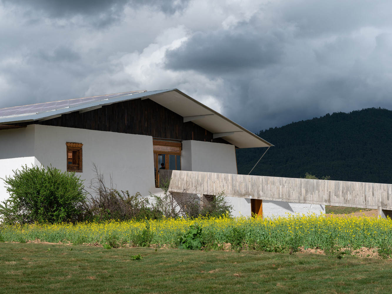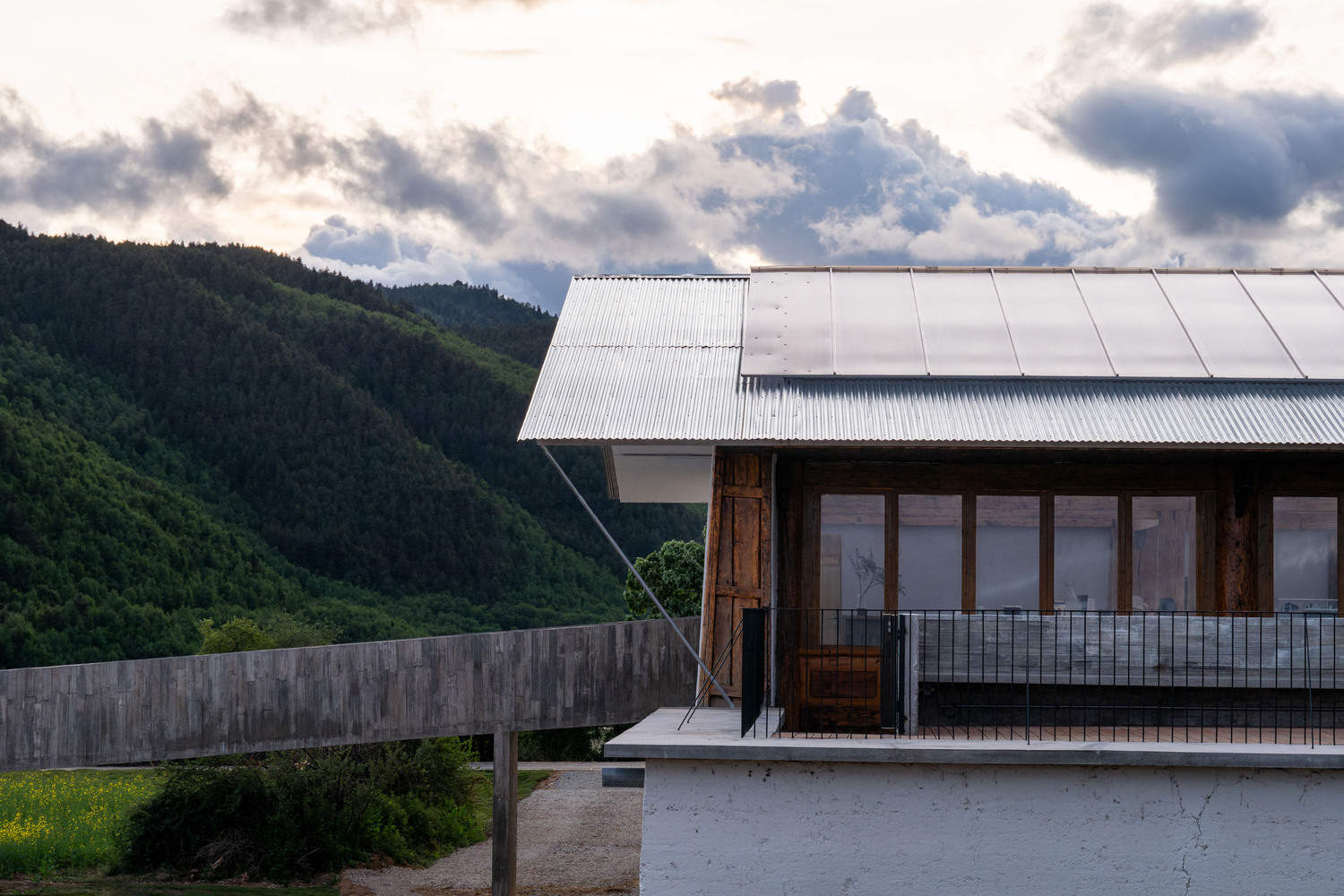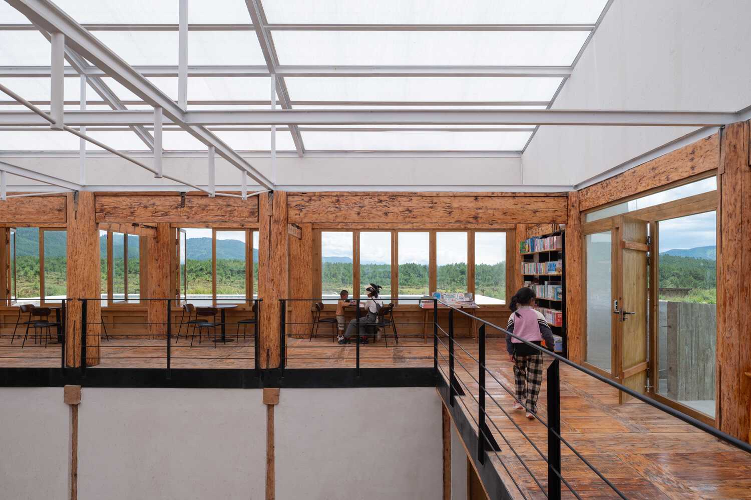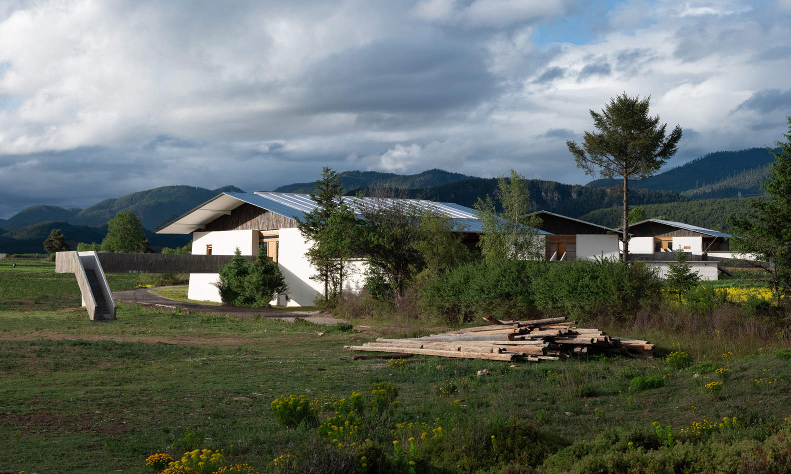 In this era of rapidly vanishing traditional craftsmanship, even in Yunnan, natural materials and handcrafted methods are becoming scarce and expensive, and may even conflict with increasingly pervasive environmental regulations. Perhaps the more remote the countryside, the more it should utilize industrialized construction systems. The lightweight steel structure and polycarbonate panel roof were the most worry-free aspects of the entire construction process (except for the unforeseen leveling process of the wooden structural beams). The main entrance canopy of the bookstore and the three corridors extending towards the land were cast in concrete. Considering the limited formwork technology and precision of the rural construction team, we simply used the wooden shingles removed from the old Tibetan house roofs as formwork. The deep grain of the wooden shingles resulted in a very mottled surface on the cast concrete, which, as it turned out, matched the overall rough construction style. Another use for the recycled wooden shingles was as cladding for the gable ends of the pitched roofs and as ceiling panels for the overhanging sections. These weathered wooden shingles, coated with varnish, took on a dark brown hue, adding a composed tone between the whitewashed walls with straw fibers and the shiny corrugated panels.