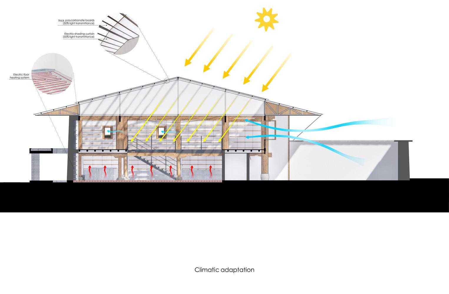 香格里拉的气候相当恶劣。每年11月,寒冷的冬天都会到来,一直持续到次年4月,此时土地开始慢慢恢复。当高原再次披上绿色的外衣时,已经是五月了。六月、七月和八月是雨季,降雨量充沛。天空经常被厚厚的云层覆盖,直到傍晚才放晴。即使在夏天,人们偶尔也会感到湿冷。高原经历了强烈的阳光,冬天经常晴朗晴朗。现代藏族住宅已经发展出一种阳光房系统。一种常见的做法是用玻璃将整个朝南的庭院围起来,形成一个大型温室,为房屋内部供暖。近年来,这种方法越来越受欢迎和完善,以至于在地级首府香格里拉市,阳光房已成为所有新住宅建筑的标准特征。这种当代乡土建筑启发了我们翻修这三座藏族房屋的主要策略。