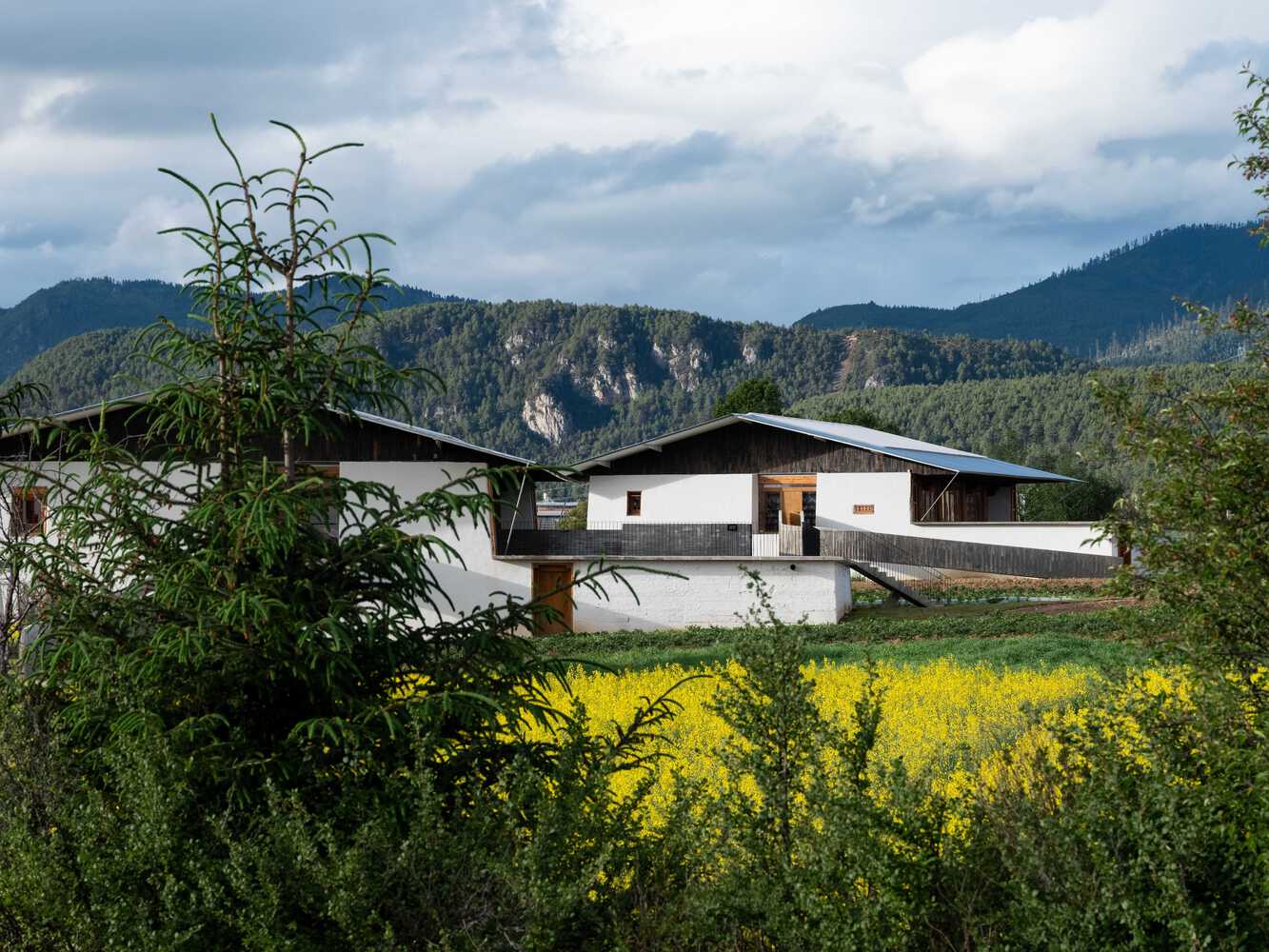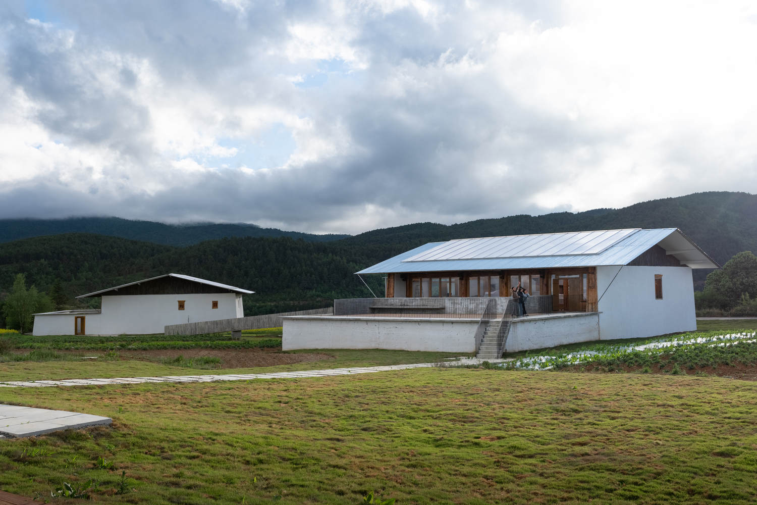 To avoid encroaching on farmland, the bookstore's corridor extends out and then bends back, landing at the courtyard gate. It then follows the ridges of the fields southward to an outdoor platform. Here, there was originally a low wall, serving as a kind of boundary marker. This location is set apart from all three Tibetan houses, offering a vantage point to view the entire scene. From there, one can approach the cultural and creative products shop to the west, climb half a flight of steps to reach a terrace, from which one can overlook the continuous pine forest stretching all the way to the distant Haba Snow Mountain. Passing through the interior of the cultural and creative products shop, a 30-meter-long ramp is elevated above the barley fields, leading directly to the back door of the café courtyard. The café's corridor extends straight out towards the reservoir, allowing for a view of the vast forest in the distance before descending the steps to approach the deeper natural surroundings.
