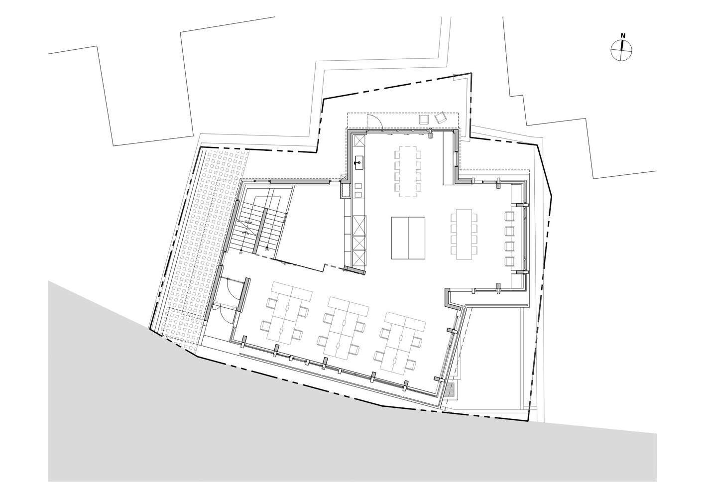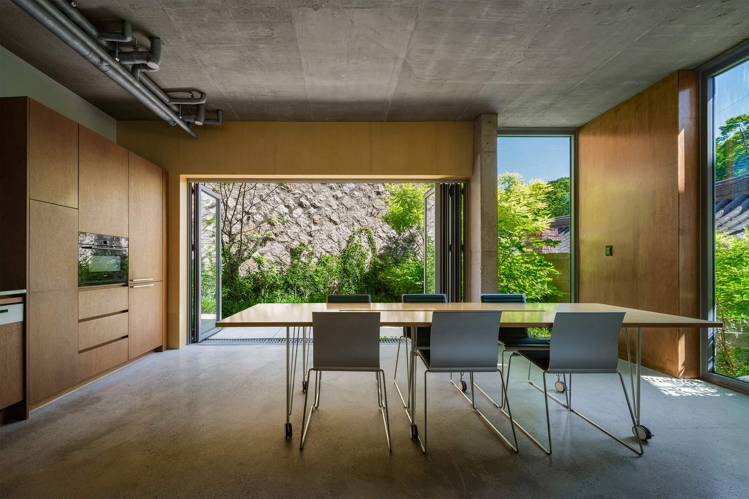 建筑特征和材料-朝南的立面以横跨两层楼的水平混凝土板为特色,向上弯曲的屋顶营造出一种运动感。该结构结合了钢筋混凝土、钢材和木材,确保了耐用性,同时保持了有机感。较低的楼层使用混凝土,而二楼则采用钢柱和木柱。木结构屋顶增强了温暖和轻盈。在东侧,三个山墙屋顶向外延伸,形成大窗户,可以看到高惠东的房子和秘密花园。这些窗户与附近的历史和文化地标形成了视觉联系。相比之下,北侧和西侧的窗户较少,确保了隐私和与周围建筑的凝聚力。