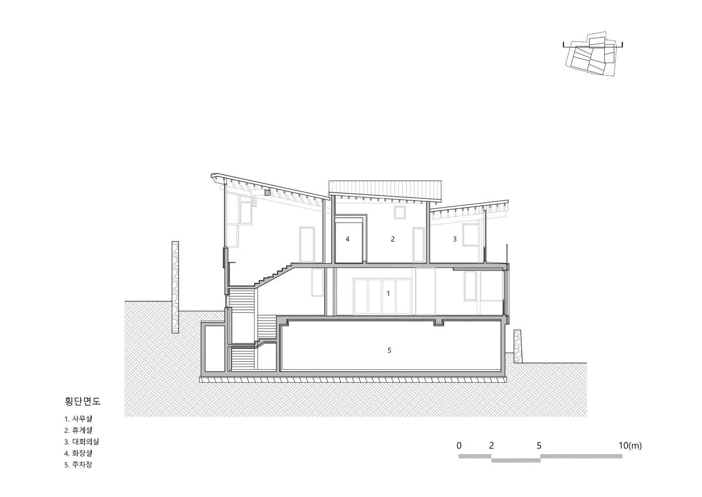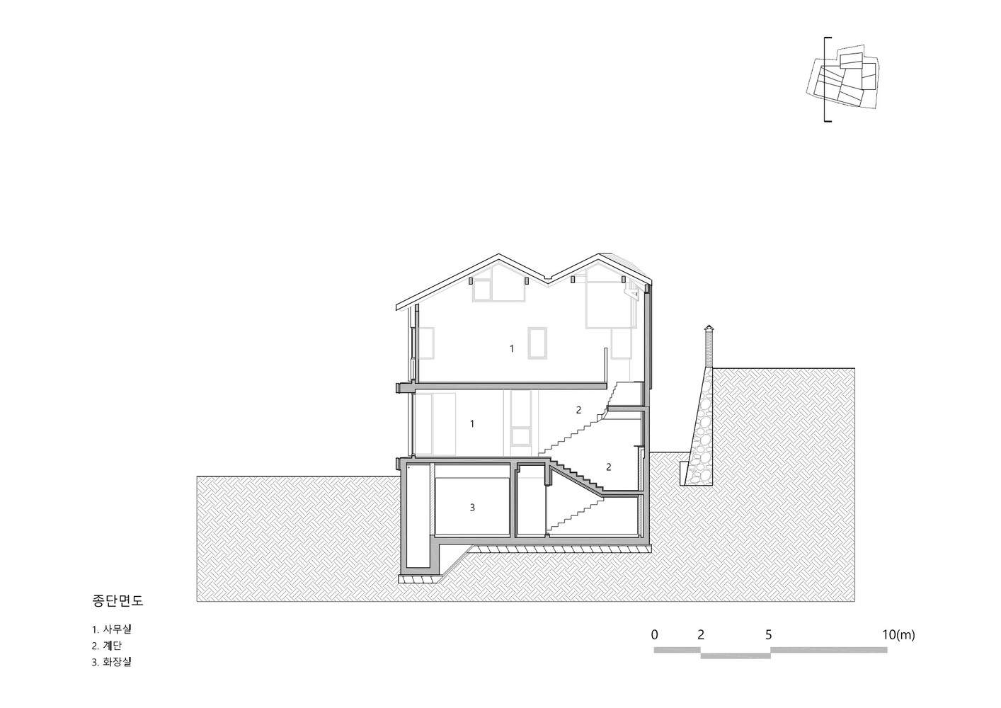 Design Concept: A Village of Roofs – Inspired by hanok architecture, the studio's design integrates five distinct roofs of varying sizes and orientations around a central flat roof, evoking a small "Wonseo-village." The gently curved rooflines mirror traditional hanok eaves, allowing the building to blend into the irregular landscape while complementing its surroundings.