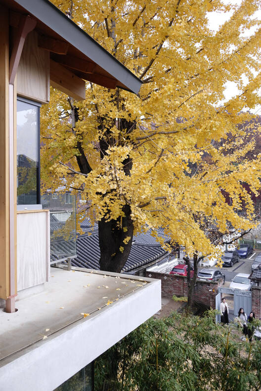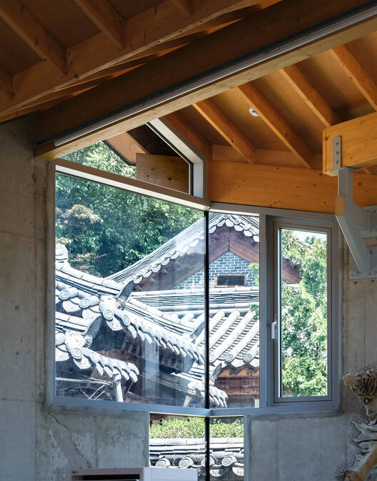 Architectural Features and Materials – The south-facing façade features horizontal concrete slabs extending across two floors, with an upward-curving roof creating a sense of movement. The structure combines reinforced concrete, steel, and timber, ensuring durability while maintaining an organic feel. The lower floors use concrete, while the second floor incorporates steel and timber columns. The timber-framed roof enhances warmth and lightness. On the east side, three gable roofs extend outward, framing large windows that offer views of Go Hui-dong's house and the Secret Garden. These windows foster a visual connection to the neighborhood's historical and cultural landmarks. In contrast, the north and west sides have fewer windows, ensuring privacy and cohesion with the surrounding buildings.