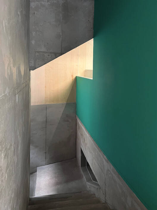 室内设计的创新与可持续性:室内设计是该项目的另一个亮点,它将实用性、美学和文化内涵完美结合。设计师巧妙地运用外露的混凝土、钢材、木材和胶合板,创造出质朴而富有质感的空间。天然木柱和泥土色调与周围环境相协调,而丹青彩墙和韩纸等传统元素的融入,则体现了对韩国文化的尊重。更令人称道的是,室内设计具有高度的灵活性,可以根据使用需求进行调整。宽敞的楼梯兼作书架,既增加了空间的功能性,又提升了设计感。此外,项目在可持续性方面也表现出色,通过天然隔热材料的使用,最大限度地减少了能源消耗,体现了对环境的责任感。