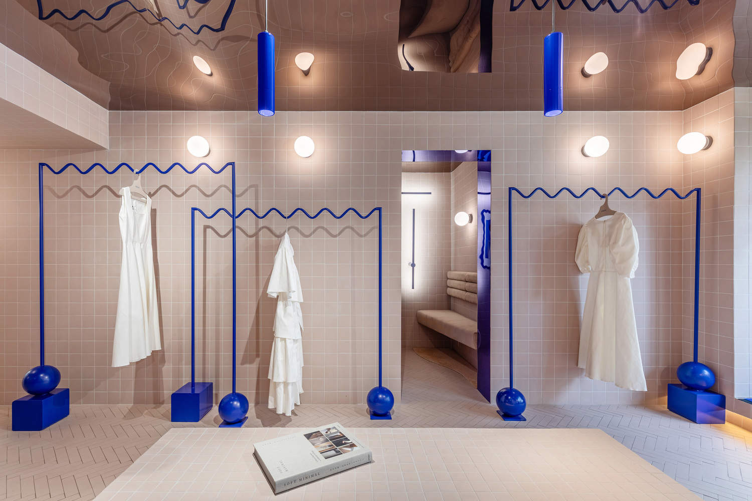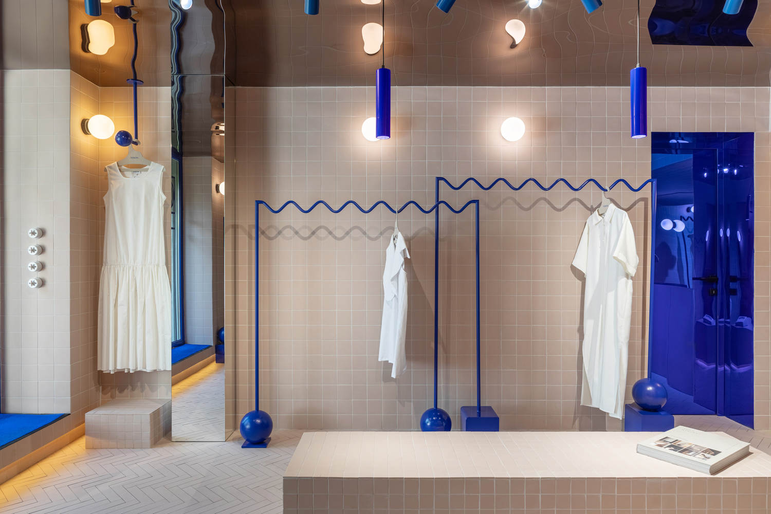 To maintain the fluid atmosphere, the metal furniture was detached from the walls. The clothing racks are made of wavy metal bars, with the waves dictating a maximum number of displayed products, thus keeping the space's crisp ambiance. The reception desk is made from a blue metal sheet that wraps around the countertop and is detached from the walls. Even the fitting room is a detached element, consisting of a freestanding mirror ensemble surrounded by a curtain.
