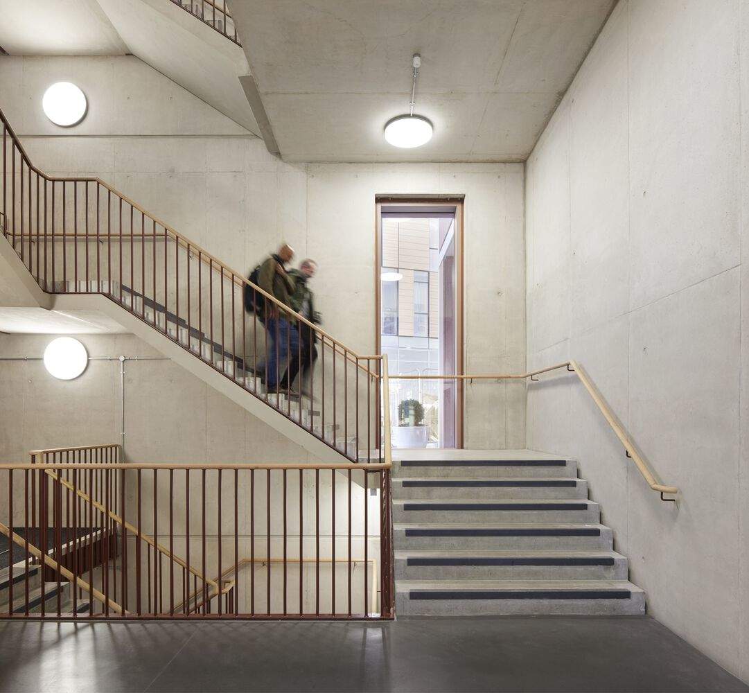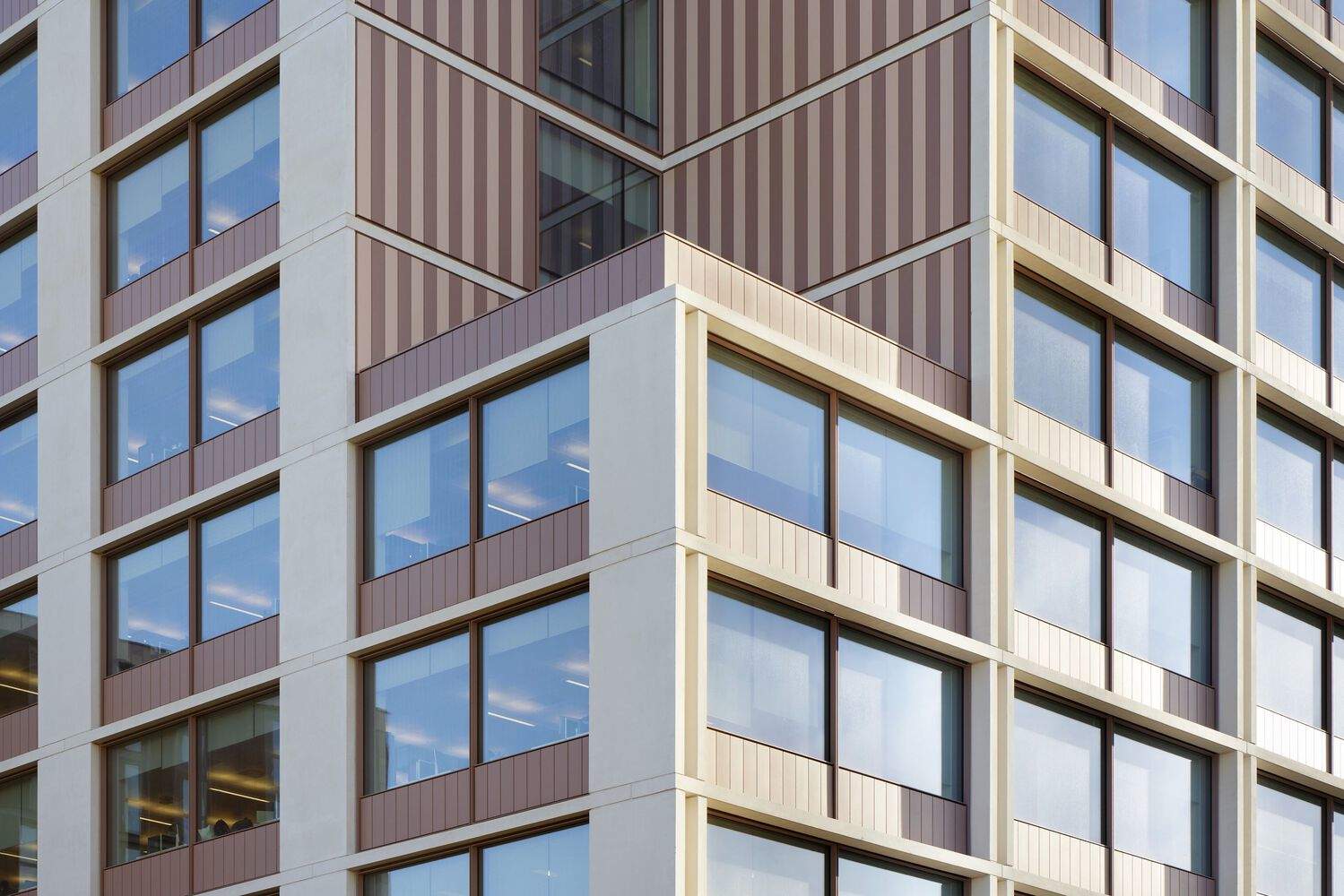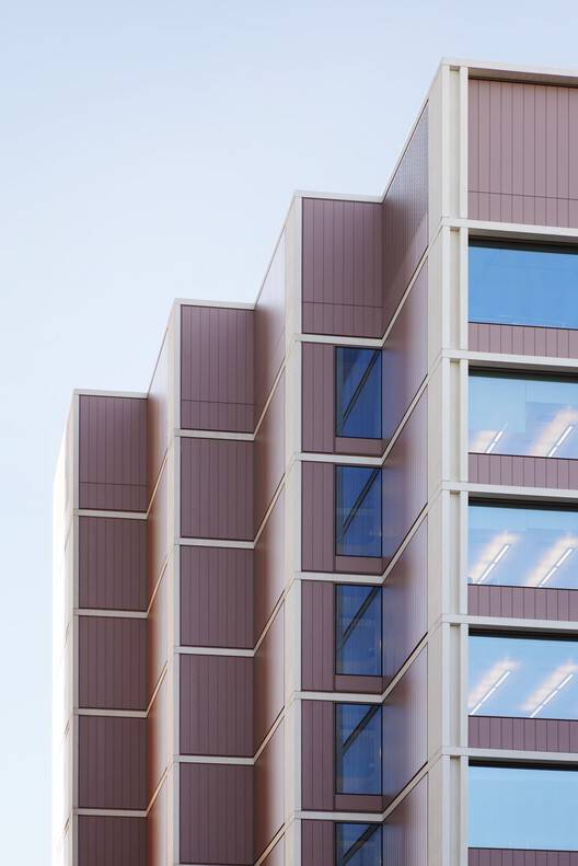 材料运用与色彩的和谐统一:在材料运用和色彩搭配方面,该项目也展现了卓越的设计理念。建筑外立面采用了淡赤陶色金属覆层与白色预制混凝土面板的组合,赋予了建筑独特的视觉魅力。室内则运用现浇清水混凝土和道格拉斯冷杉,营造出简洁、现代的氛围。深红色的隔音板、涂漆门、瓷砖等细节,与建筑的整体色调保持和谐统一,形成了一种富有层次感和品质感的视觉体验。这种对材料和色彩的精心选择与搭配,不仅提升了建筑的美观性,也强调了建筑的实用性,营造了舒适宜人的工作和学习环境。