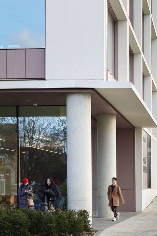 城市文脉的巧妙回应与平衡:该项目在城市文脉的应对上展现出巧妙的平衡。建筑师充分考虑了项目所处的位置,以及与周围环境的关系。建筑在伍德巷的维多利亚式露台和南侧的高层住宅楼之间,在高度上做了精妙的协调,避免了突兀感,融入了周边环境。北立面开放透明,面向城市,而南立面则采用了阶梯式设计,保护了使用者隐私。建筑入口位于横跨北立面的柱廊中心,并面向校园中心的小广场,清晰地定义了入口,展现了对来访者的尊重。这种设计策略使建筑既融入了城市肌理,又强调了自身的存在感,体现了建筑师对城市设计的深刻理解。