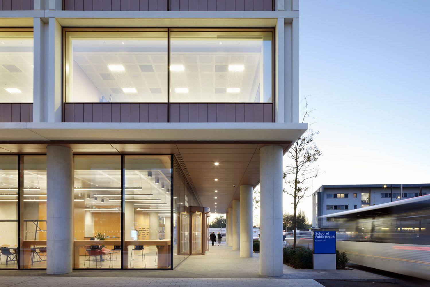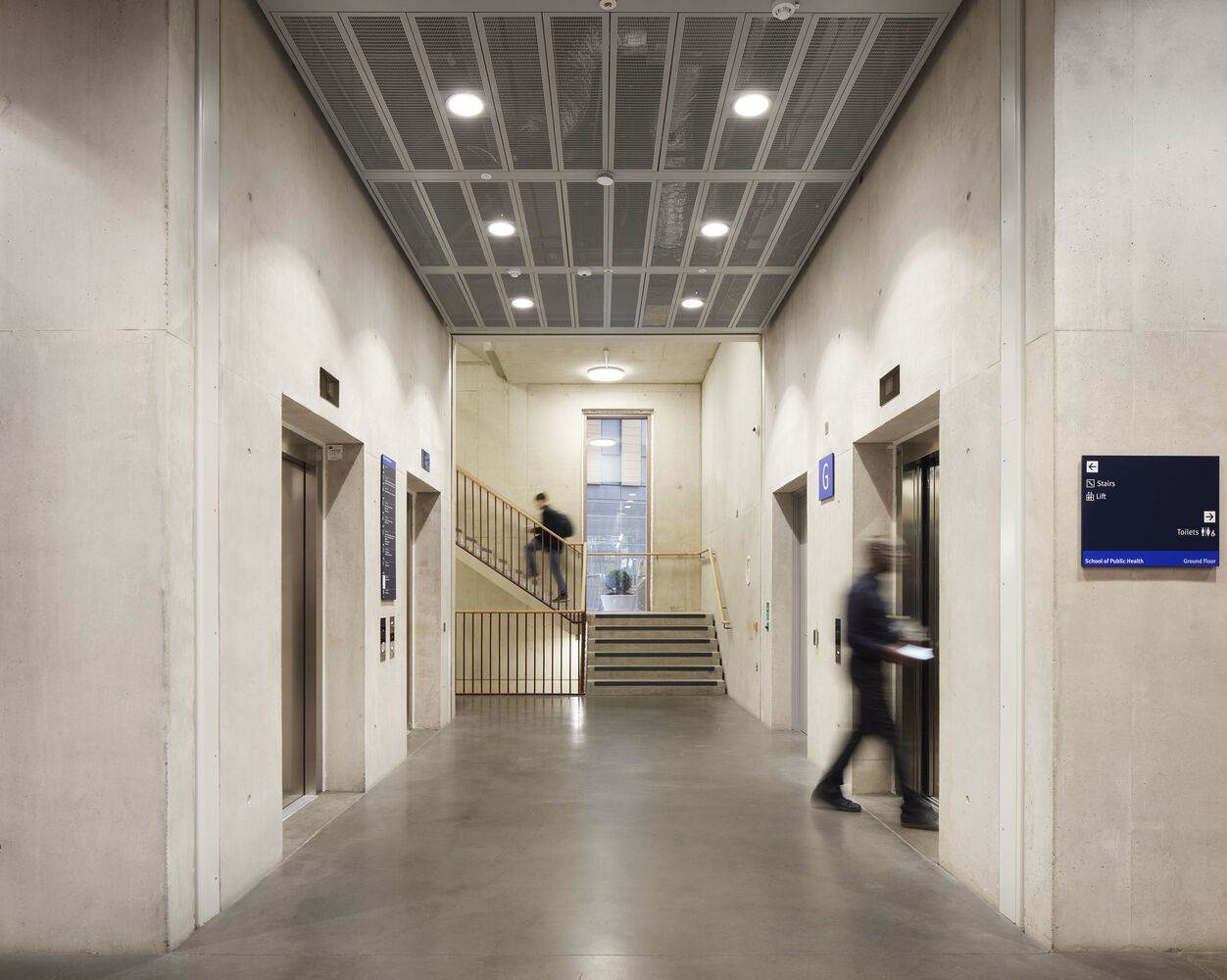 Location and Campus Role - The School of Public Health is only an eight minute walk from Hammersmith Hospital Campus, and the building plays an important urban role, addressing visitors approaching from the north and marking arrival at the Imperial White City North Campus. The building entrance is located at the centre of a colonnade spanning the north elevation, while on its eastern side it addresses the small square at the heart of the campus. At 10-storeys, the School's height mediates between the scale of Victorian terraces on Wood Lane and the high-rise residential tower of 88 Wood Lane to the south.