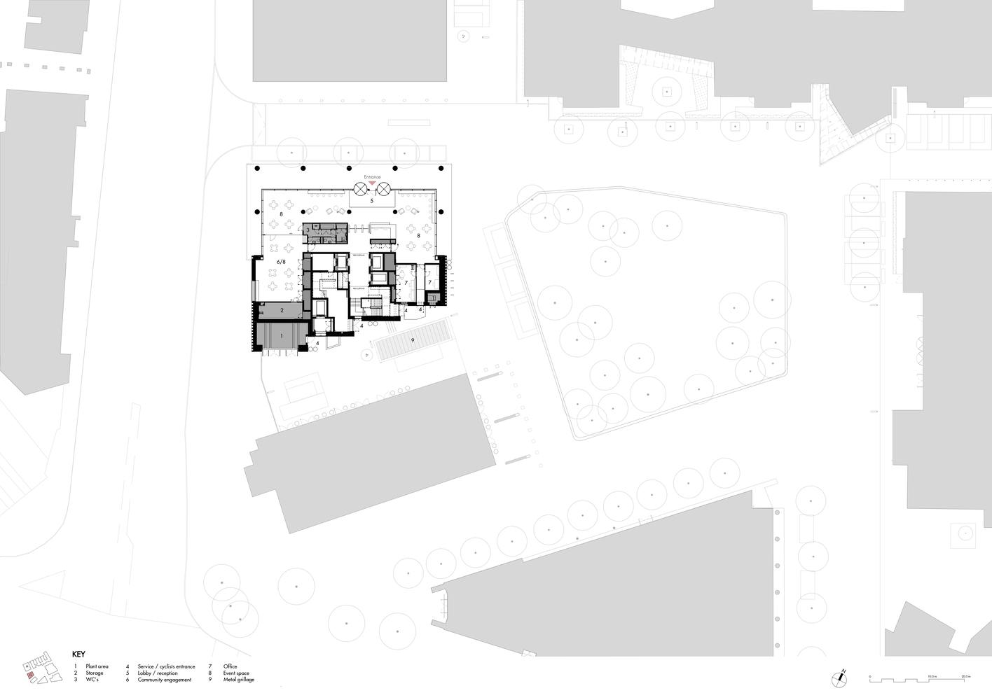 学校有十层楼(加上屋顶植物)。目前的配置在3-7层提供3230平方米的办公、研究和社区参与空间,在1层和2层提供教学空间。地下室用于存放自行车和植物。地板围绕标准隔间尺寸设计,便于内部重新布置。每个隔间为7.8m x 7.8m,可以安排提供从大型开放空间到小型蜂窝办公室的一切。通过将建筑的核心向南推进,在每一层典型的楼层上都创造了采光良好、眩光最小的大型灵活空间。每层楼都有提供员工和学生便利设施以及非正式社交空间的区域。为了保护隐私,南立面是阶梯式的,朝东的窗户被隐藏起来,以避开对面的住宅楼。相比之下,朝北的立面是开放透明的。在一楼,从接待区到宽敞的采光楼梯间的景色有助于寻路,并符合公共卫生愿望,鼓励积极流通。同样在一楼,一个灵活且可分割的85平方米的空间用于社区使用和外展,将学校这一重要的工作成果公之于众,从繁忙的Wood Lane街上清晰可见。