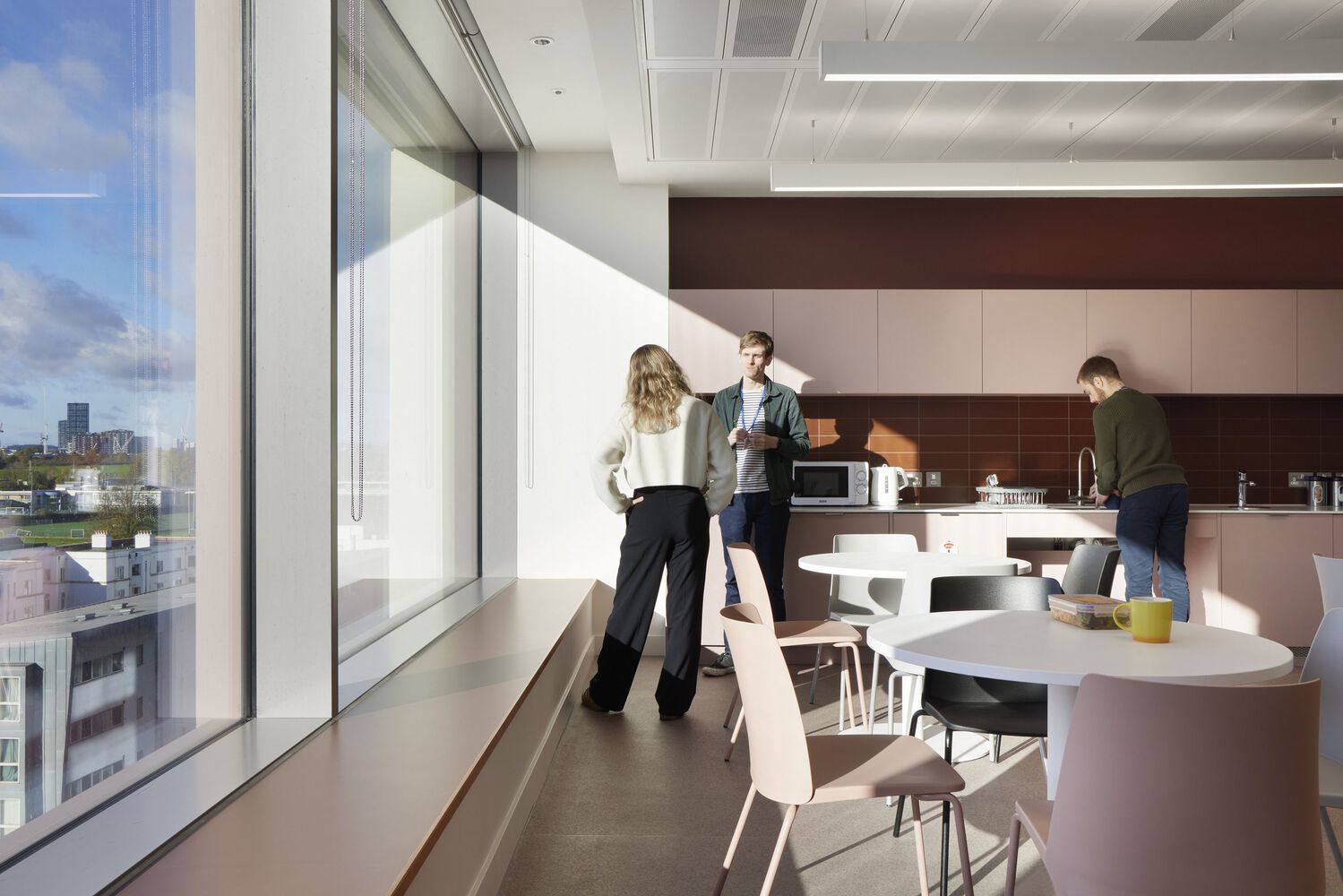 The School is organized over ten floors (plus roof plant). The current configuration provides 3230 sqm of office, research and community engagement space over floors 3-7, with teaching space on floors 1 and 2. A basement accommodates cycle storage and plant. Floor plates are designed around a standard bay size for simple internal rearrangement. Each bay is 7.8m x 7.8m and can be arranged to provide everything from large open space to small cellular offices. By pushing the building's core to the south, large flexible spaces with good daylight and minimal glare have been created on each typical floor. There are also areas on each floor providing staff and student amenity and informal social space. For privacy, the south facade is stepped, with east-facing windows concealed to turn away from the residential building opposite. The north-facing facade by contrast is open and transparent. On the ground floor, views through from the reception area to the generous daylit stairwell aid wayfinding and, in line with public health aspirations, encourage active circulation. Also on the ground floor, a flexible and divisible 85 sqm space for community uses and outreach puts this important strand of the School's work on public display, clearly visible from and addressing the busy Wood Lane street.