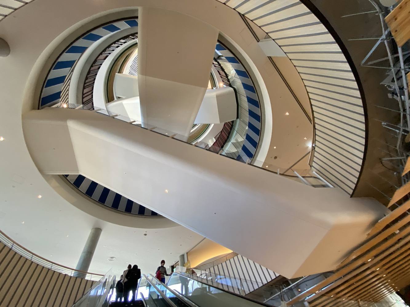 However, once you step inside, you will be pleasantly surprised. There is a large circular atrium in the middle, making the entire seven floors almost one space. The escalators over the atrium do not run in parallel but cross each other at different angles. The impression is that of a stacked Charles de Gaulle airport in Paris, with an absorbing ascent. The atrium is named the 'Vertical path.'