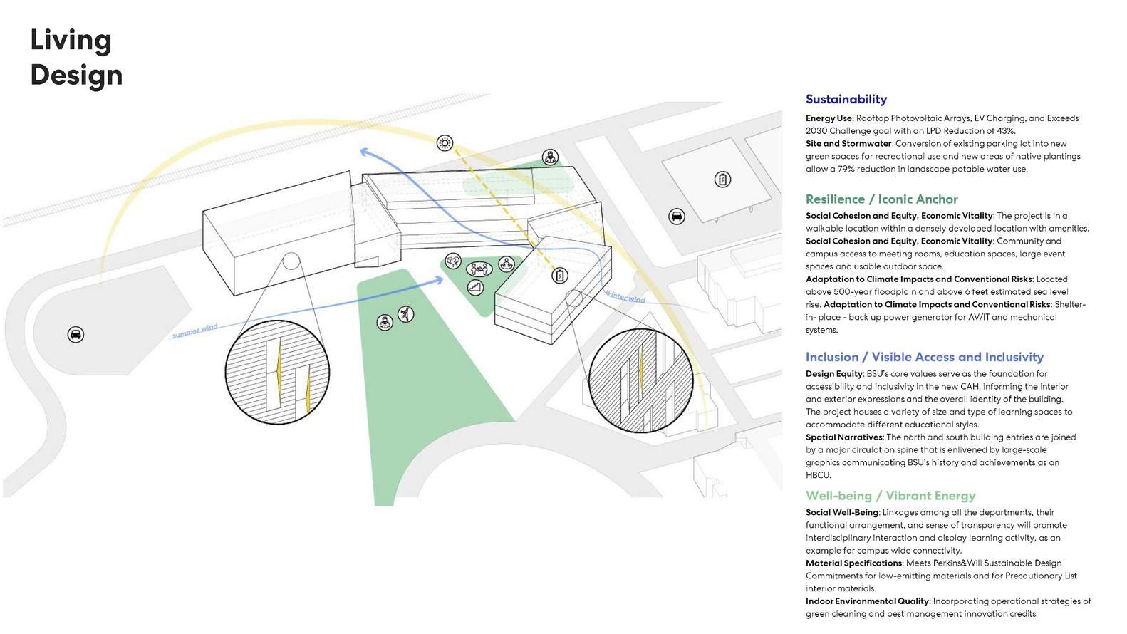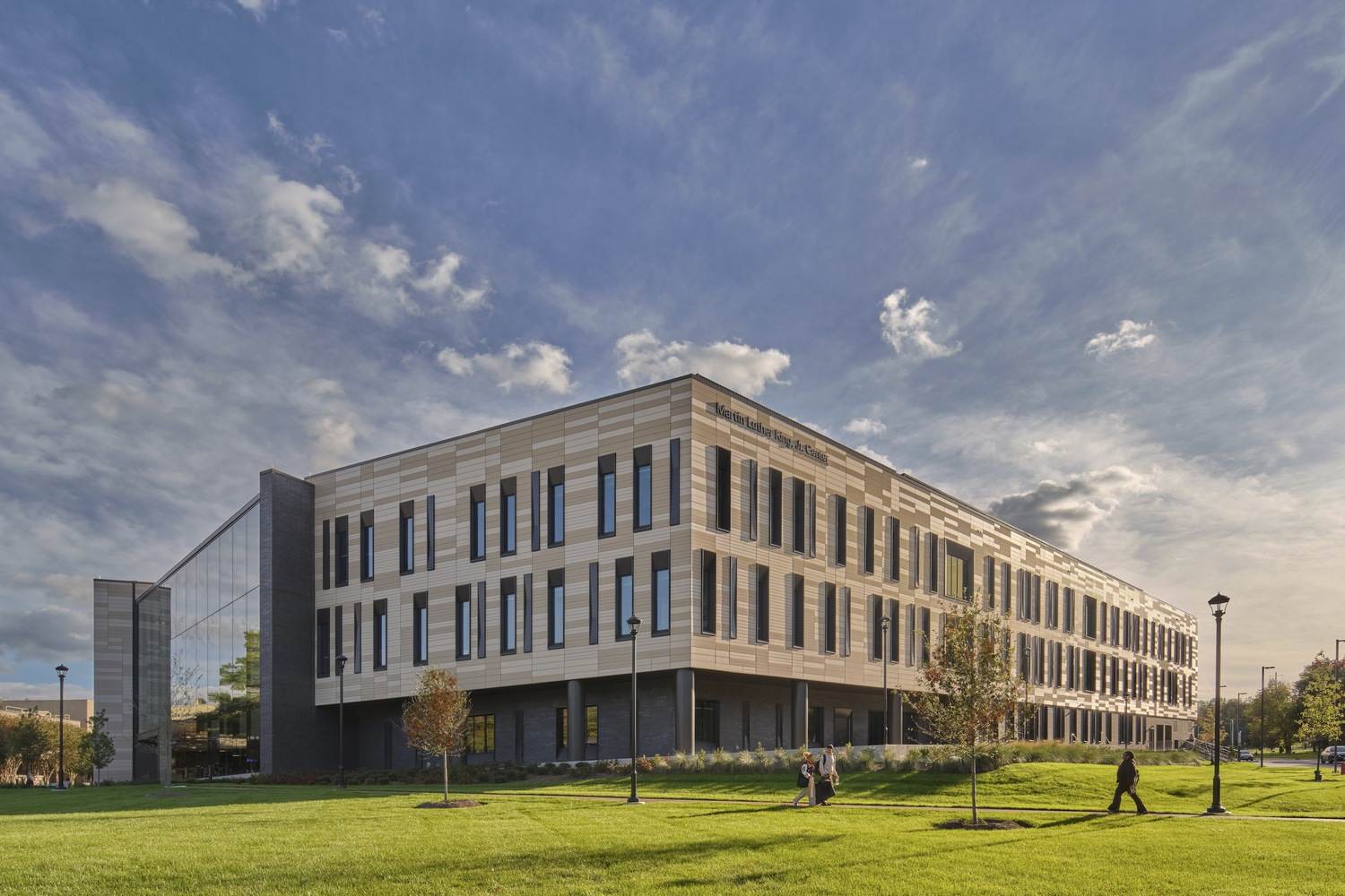 With a focus on visibility, connectivity, and storytelling, the Martin Luther King, Jr. Center is an inclusive, welcoming space. An iconic vocal waveform façade on the auditorium, its design inspired by the sound wave pattern of Dr. King's Nobel Peace Prize acceptance speech from 1964, is strategically placed as a gateway between the Bowie train station and the campus. Glass façades on the north and south faces of the building convey openness. The South entrance welcomes students and visitors, providing a reception space—or "Inflection"—to connect before and after events in the auditorium.