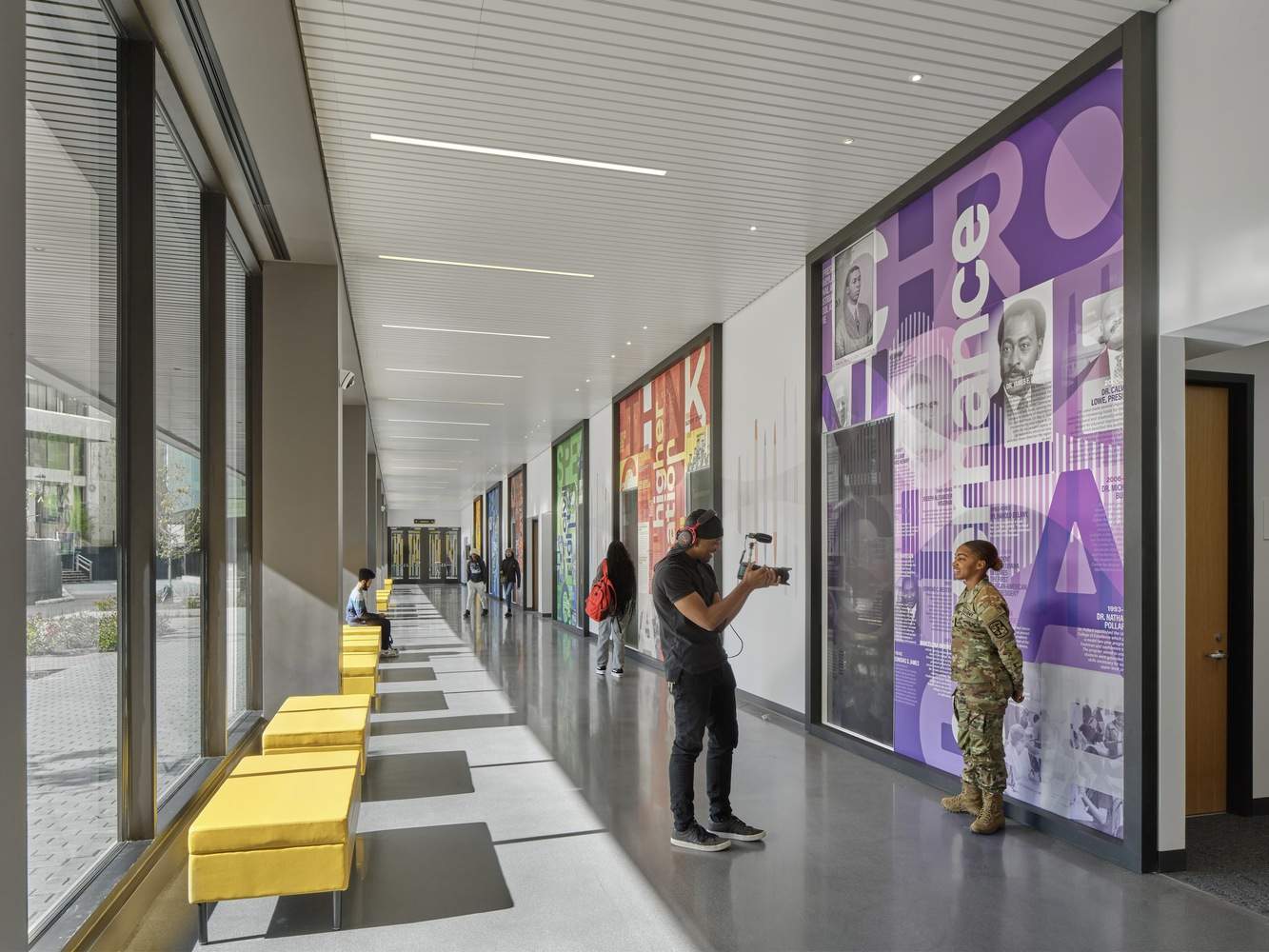 The Historical Legacy Corridor, a connecting hallway on the ground floor, features mixed-media artwork highlighting the skills essential to succeed in academic life: Exploring Culture, Thinking Critically, Organizing Change, Speaking Publicly, Reading to Connect, and Analyzing Mindfully. Each panel uniquely pairs an academic skill with notable events in African American and campus history to create a non-linear heritage timeline intended to spark new ways of thinking, depicted through photography, written word, color, and graphic elements.