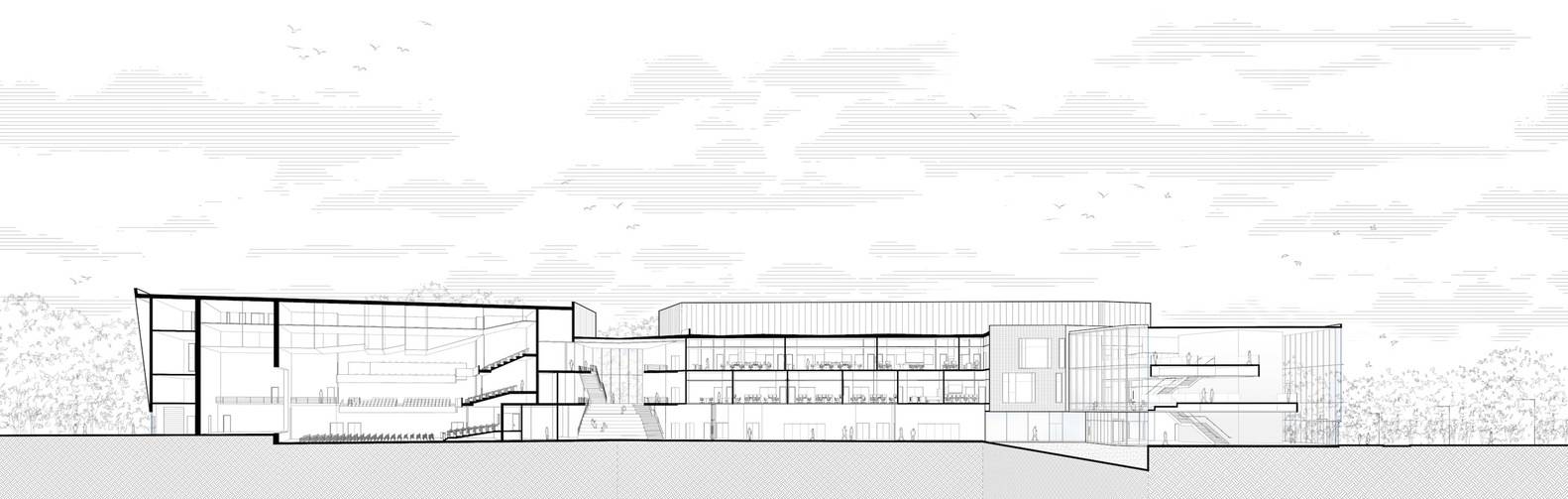 作为学术中心和校园门户,该设施提供跨不同研究领域的专业学习环境,包括历史、语言、文学、传播、表演艺术和媒体研究。专业学习环境包括录音室、专业广播电视演播室、视频编辑室、GIS实验室、资源库、配备技术的多媒体教室、灵活的礼堂和活动空间、室外露天剧场等。