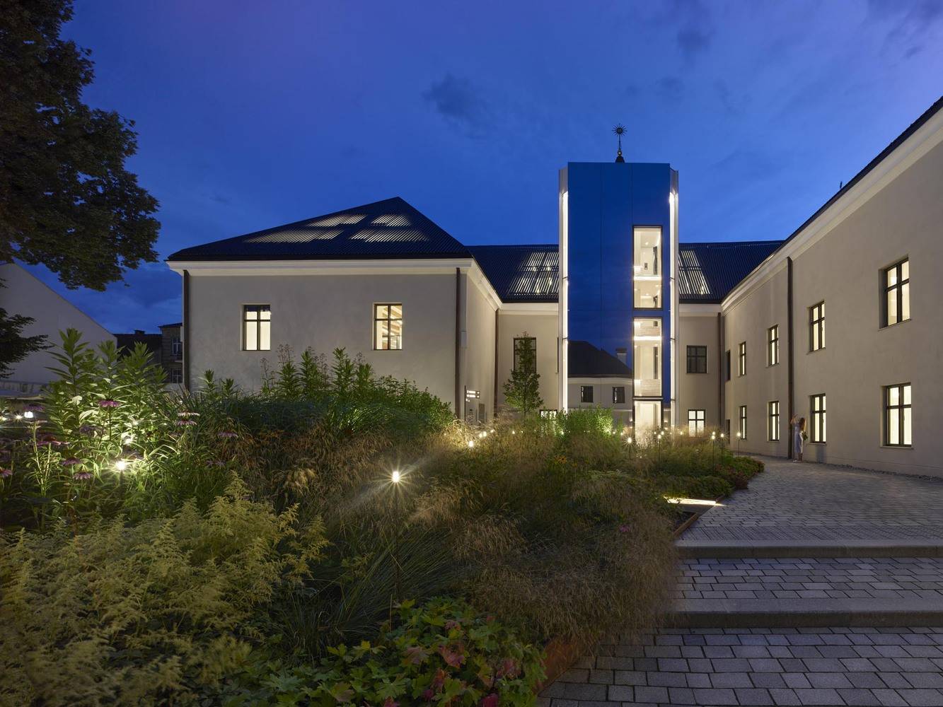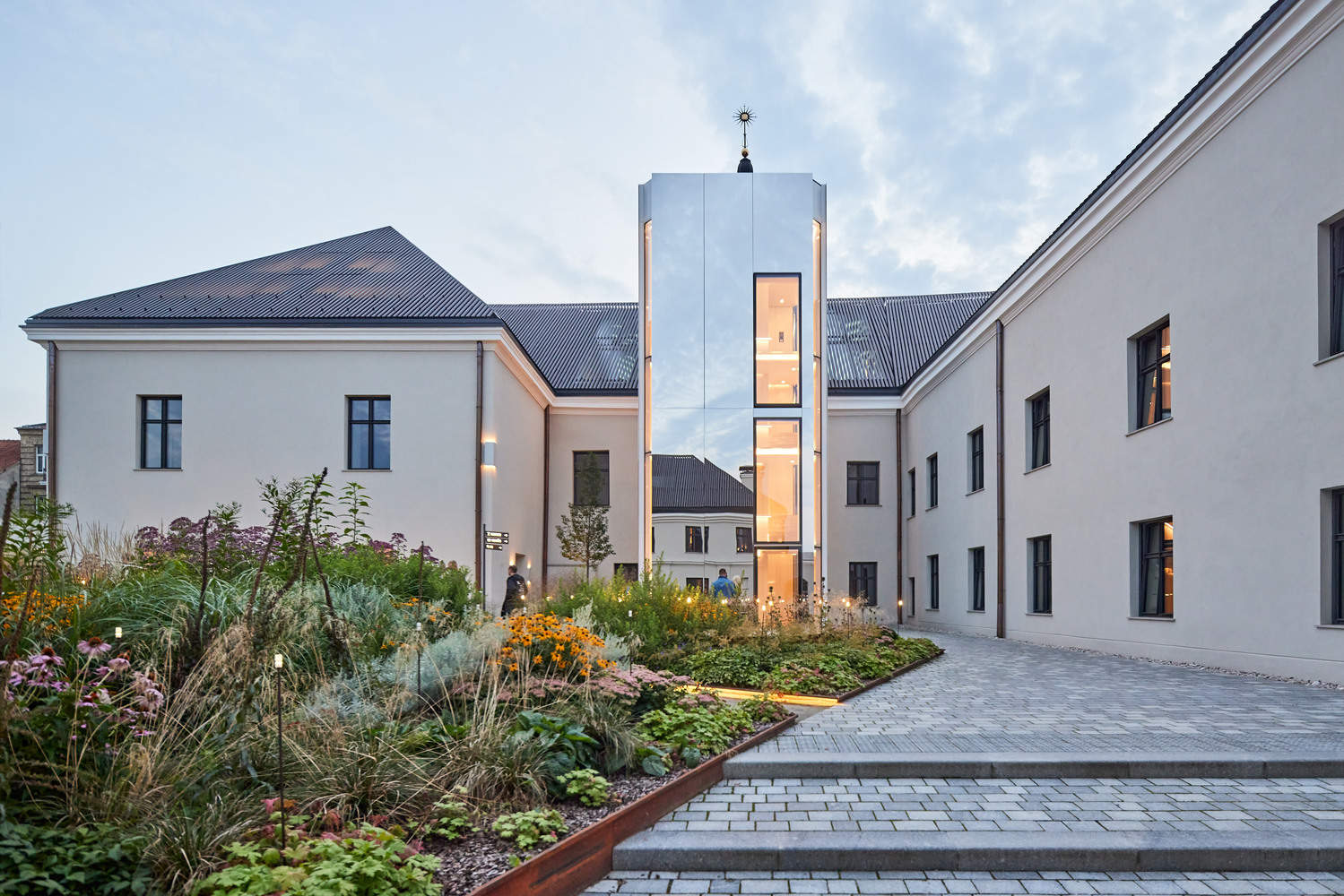 空间设计的多元与融合:该项目的空间设计展现出极高的多元性和融合性。项目涵盖了表演艺术空间、爵士酒吧、餐厅、水疗中心、住宅和办公场所,多种功能在6栋建筑和广阔庭院中交织。建筑师通过巧妙的空间布局,连接了地下地窖与公共庭院,利用玻璃基础将旧建筑元素融入新设计。尤其值得一提的是,项目在屋顶设计上的创新,采用了钢板的排列方式,既满足了规划许可的要求,保持了与周边建筑的协调,又保证了自然光的引入。这种对不同功能、不同时代建筑的融合,使得Boksto Skveras成为一个充满活力、引人入胜的城市综合体。