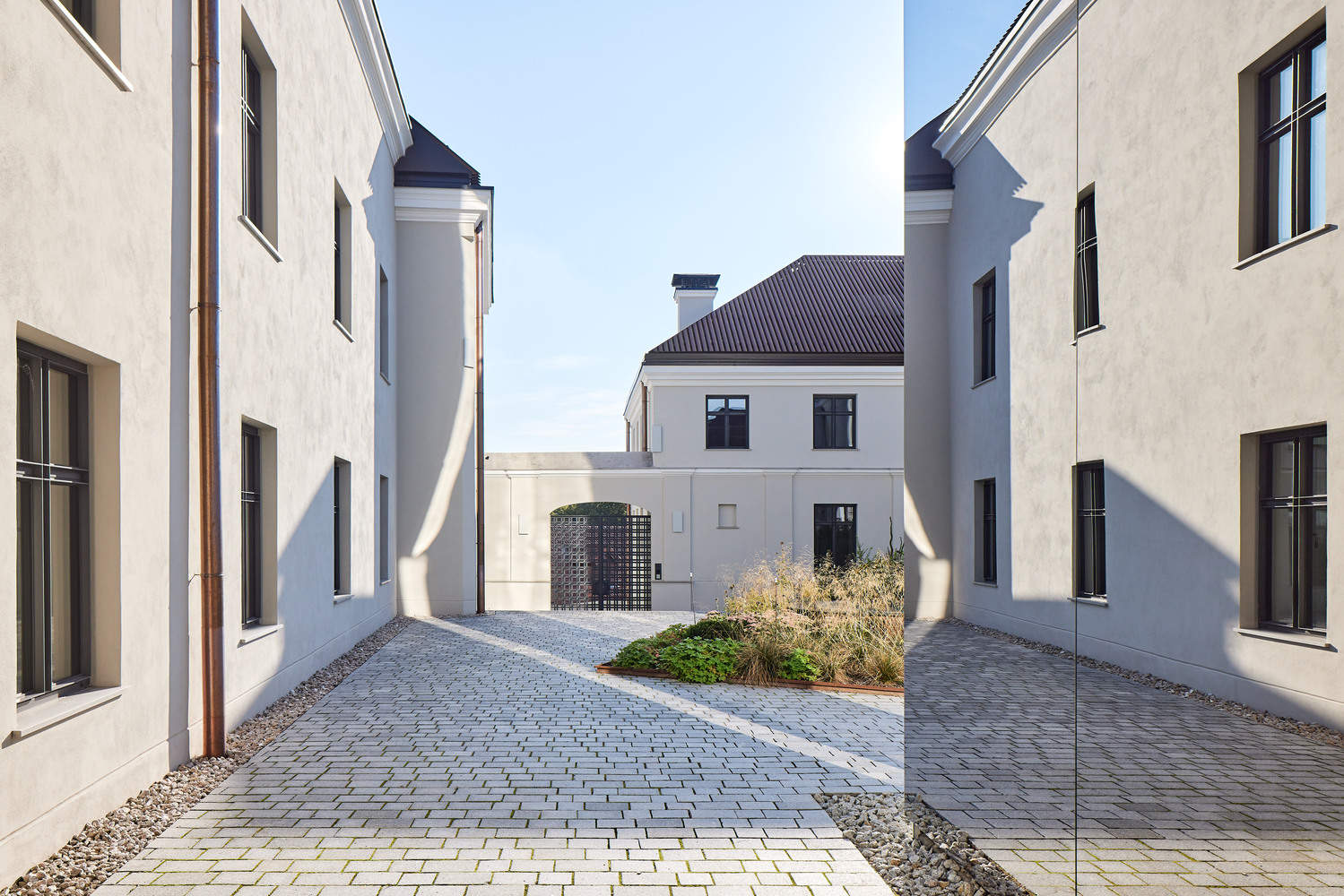 有了如此丰富、多样和受保护的历史,保护和恢复的概念变得至关重要。任何新的建筑元素都必须经过仔细考虑,才能插入现有的结构中,并且在可能的情况下,应恢复和保护该遗址的历史元素。规划立法同意,老城区的所有建筑都可以有陶瓷屋顶瓦片和Velux窗户。人们一致认为,这将不利于大型不间断斜屋顶的巴洛克式建筑质量,因此这是用垂直的钢板建造的,可以露出下面的玻璃区域,使屋顶开口能够融入屋顶系统。