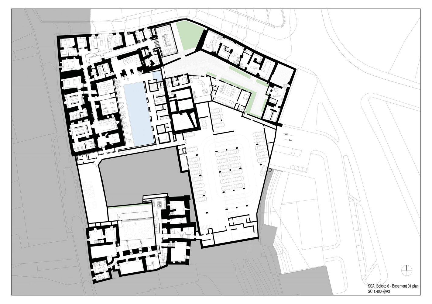 Boksto Skveras is the culmination of over 10 years of design, development, and collaboration with local partners. The studio utilized the Gothic vaulted cellars for the sunken restaurant, opening up the surroundings so that natural light floods into the space and links to the public courtyard where visitors can dwell. Boksto Skveras's status as a protected asset meant the brickwork of the underground cellars could not be broken up or modified. The exposed bricks now create part of the visitor experience to the subterranean health spa with a 25-meter swimming pool. The ancient clock tower is repurposed as office space, utilizing glass foundations to weave elements of the old building into the new design. For the roof, SSA used an arrangement of steel slats to allow natural light into the building while maintaining the appearance of a solid roof, another condition of the planning permissions to keep the building in line with neighbouring architecture.