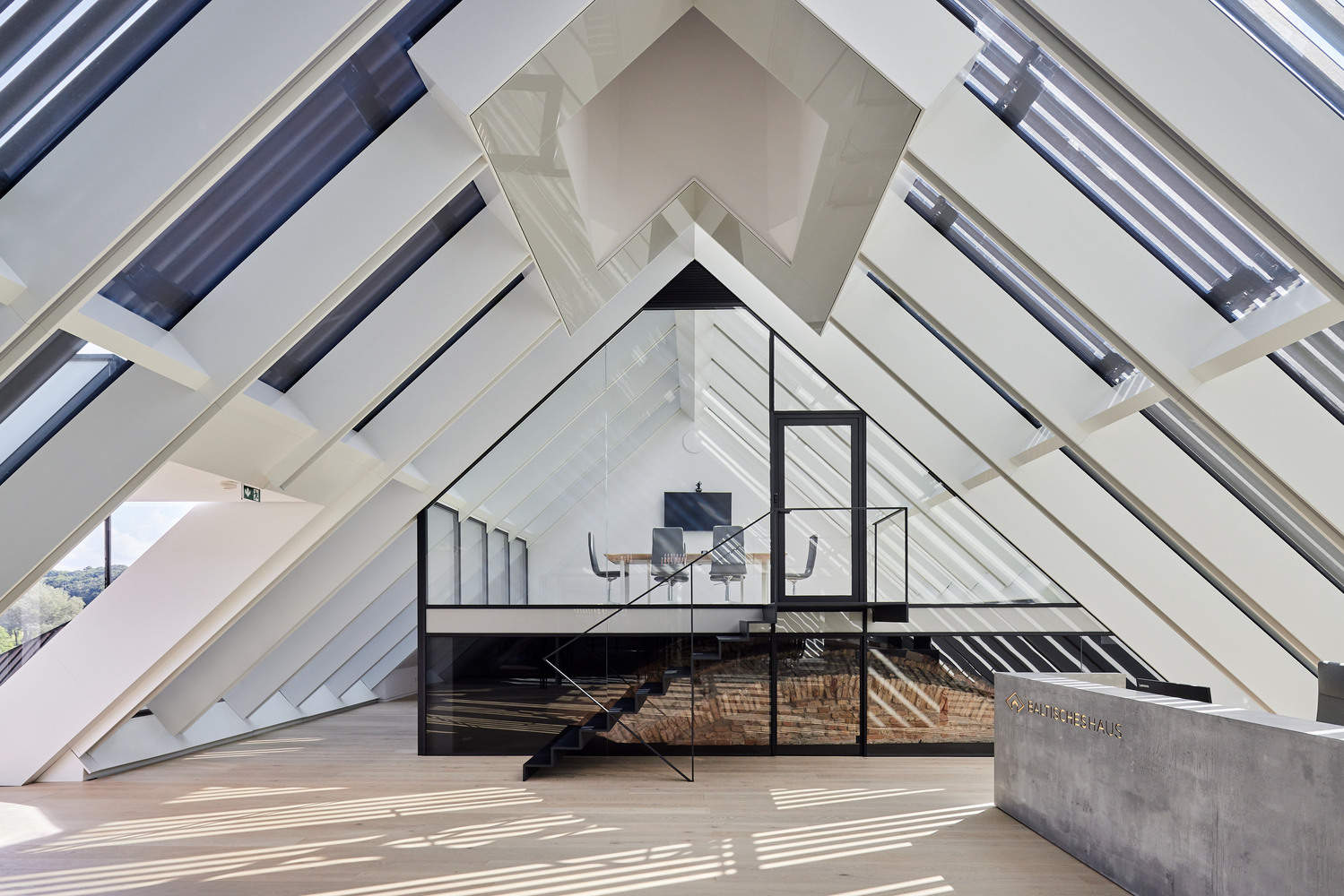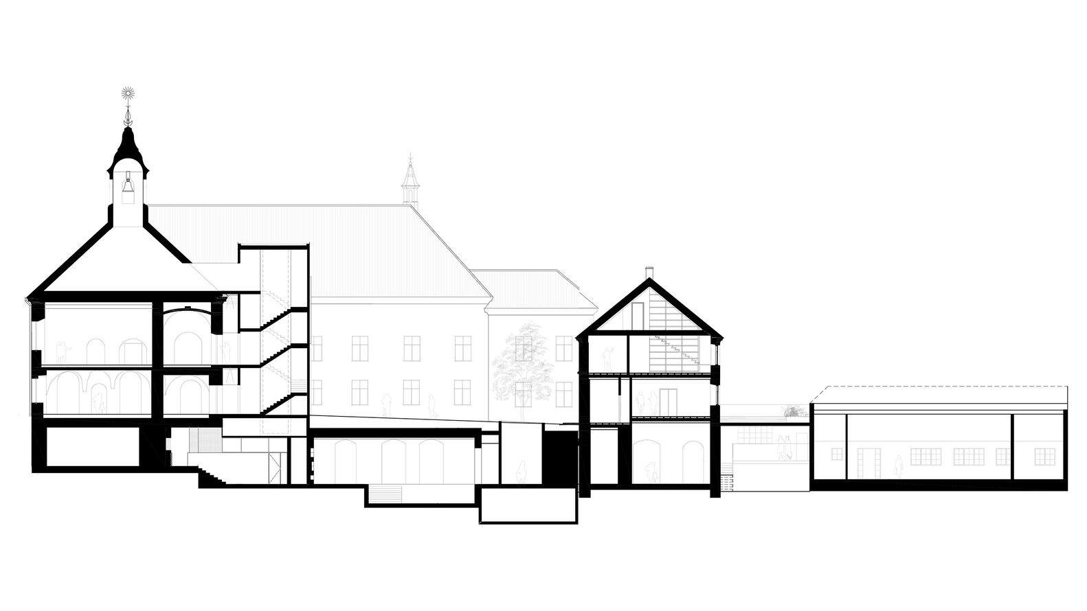 With such a rich, varied and protected history, the conservation and restoration concept became crucial. Any new build element had to be a carefully considered insertion into the existing fabric, and, where possible, the historic elements of the site should be restored and preserved. Planning legislation agreed that all buildings in the Old Town could have ceramic roof tiles and Velux windows. It was agreed that this would be detrimental to the Baroque building mass of a large uninterrupted pitched roof, so this was constructed with vertical steel slats that reveal areas of glazing underneath, allowing roof openings to be integrated into the roofing system.