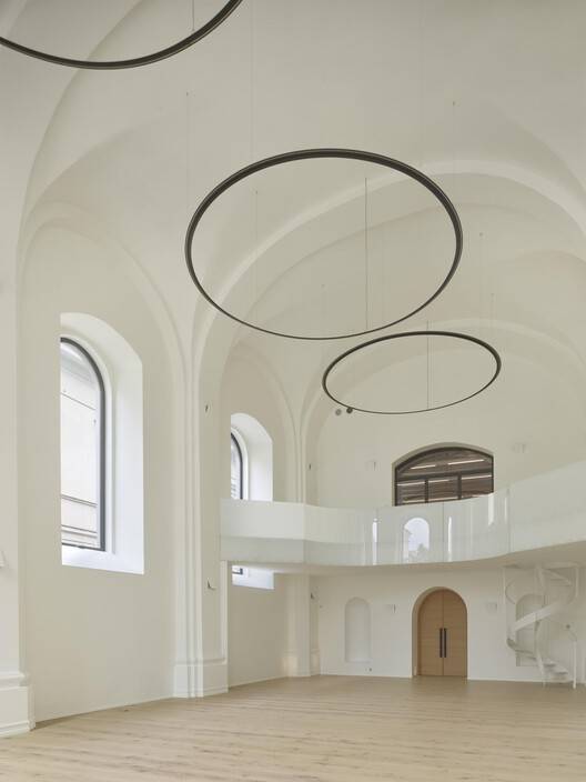 可持续设计与细节的考量:项目在可持续设计方面也展现出精湛的技艺。在面对诸多历史保护的限制下,建筑师依然注重对自然光的利用,通过屋顶设计、开放地窖等方式,提升了建筑的采光性能。同时,对原有材料的保护和再利用,也是该项目可持续设计理念的重要体现。细节方面,项目对原有建筑的修复与装饰,都经过精心考量,例如对巴洛克和哥特式建筑的修复。这种对细节的关注,赋予了建筑独特的魅力和历史感,使得Boksto Skveras不仅仅是一栋建筑,更是一件值得细细品味的艺术品。