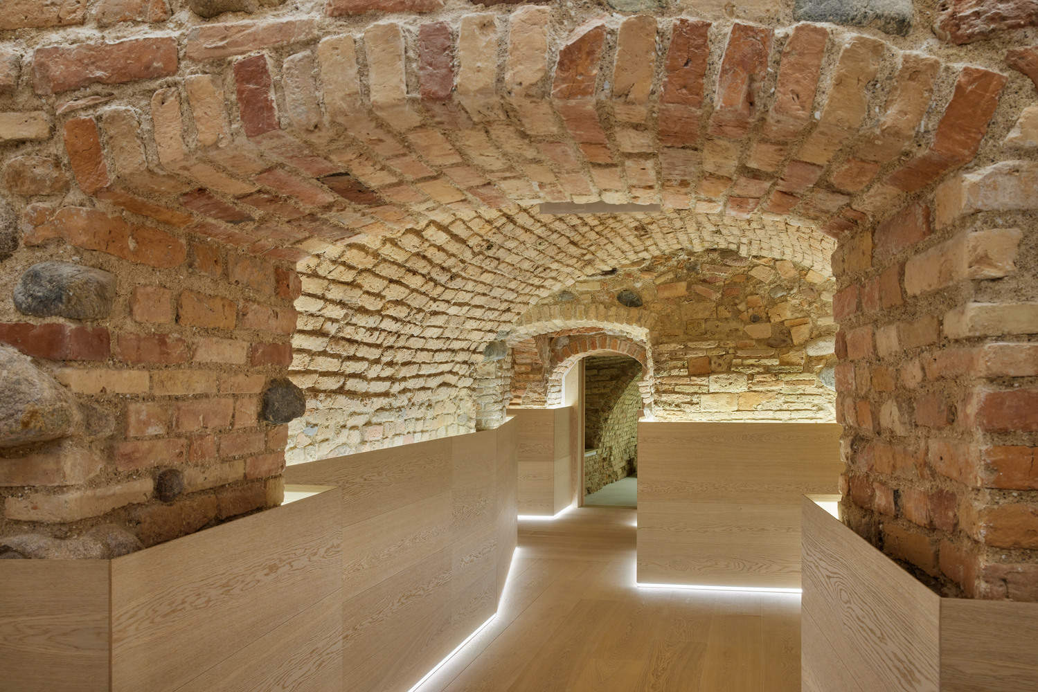 历史文脉的尊重与创新:Boksto Skveras项目最令人称道的,在于其对历史文脉的深刻尊重与巧妙利用。项目位于维尔纽斯历史中心,是联合国教科文组织世界遗产地,这意味着建筑师需要面对复杂的保护要求。Seilern建筑师工作室没有选择简单地推倒重建,而是耗费多年时间进行深入研究,试图修复和展示现存建筑。通过保留原始结构,改造哥特式地窖为餐厅,并巧妙地将现代元素融入到历史建筑中,如使用高度抛光的不锈钢作为新建筑的覆层,实现了新旧对话的和谐统一。这种对历史的敬畏和对创新的追求,使得项目在保护和更新之间找到了完美的平衡点。