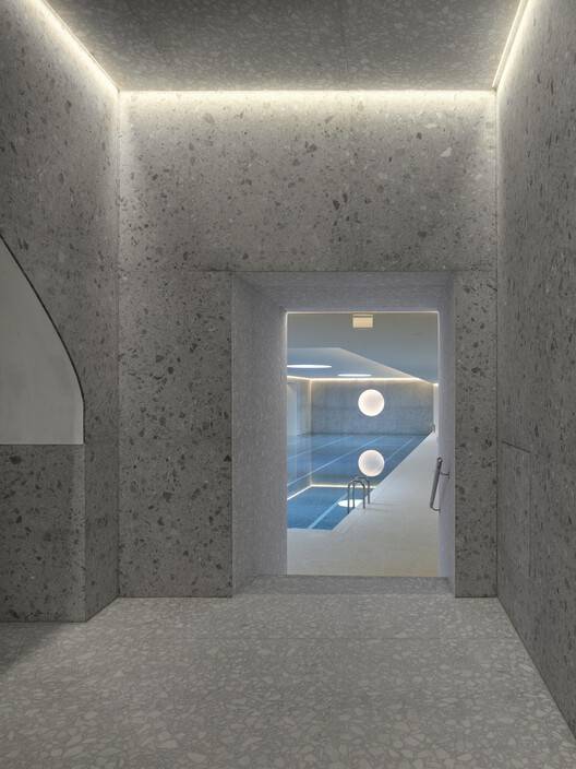 Boksto Skveras是10多年设计、开发和与当地合作伙伴合作的结晶。工作室利用哥特式拱形地窖作为下沉式餐厅,开放了周围环境,使自然光涌入空间,并与游客可以居住的公共庭院相连。Boksto Skveras作为受保护资产的地位意味着地下地窖的砖砌结构不能被拆除或修改。裸露的砖块现在为游客提供了25米游泳池的地下健康水疗中心的部分体验。这座古老的钟楼被改建为办公空间,利用玻璃基础将旧建筑的元素融入新的设计中。对于屋顶,SSA使用了钢板的布置,让自然光进入建筑,同时保持坚固屋顶的外观,这是规划许可的另一个条件,使建筑与邻近的建筑保持一致。