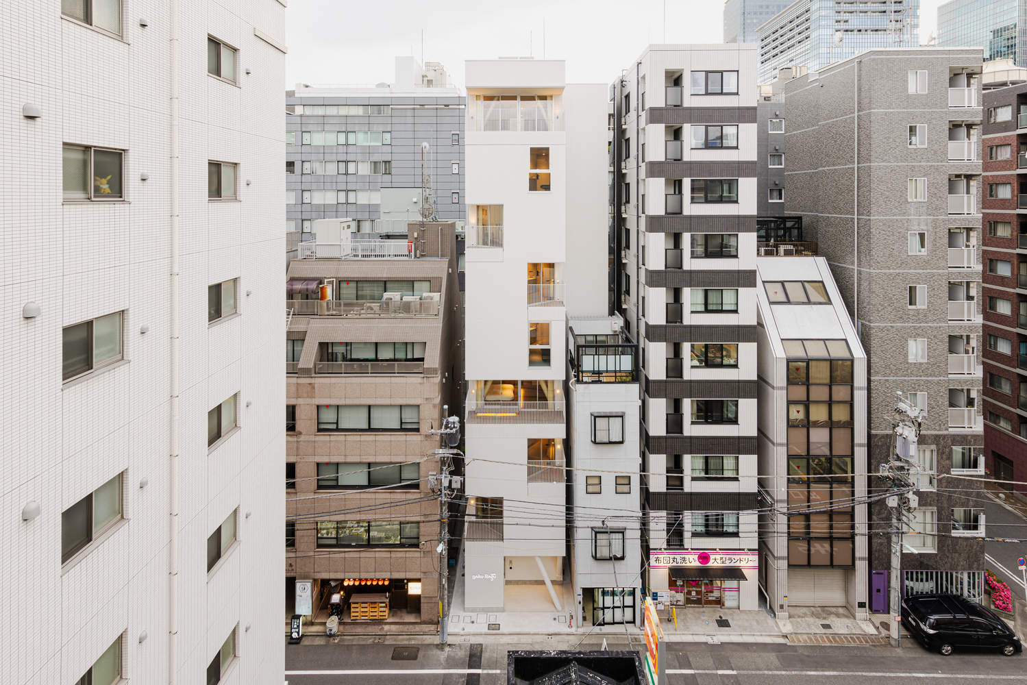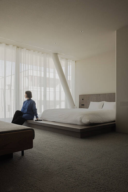Text description provided by the architects. On a limited 84-square-meter plot in Tokyo's central district, kooo Architects focused on the "gaps" within the urban fabric to design Hotel Rakuragu — a 9-story hotel with open views despite its compact site. Terrace: The area is surrounded by typical mixed-use buildings in downtown Tokyo, lacking scenic vistas or uniform design regulations for neighboring structures in height, width, or materials. Unlike typical Tokyo hotels that omit balconies to maximize room space, kooo Architects observed the surrounding buildings and oriented each floor's openings toward urban gaps, creating balconies in varying directions. Each room features a unique balcony design, allowing guests to experience diverse views from different floors. This approach resulted in a building that appears as a white cuboid carved with irregular voids, forming a rhythmic façade.