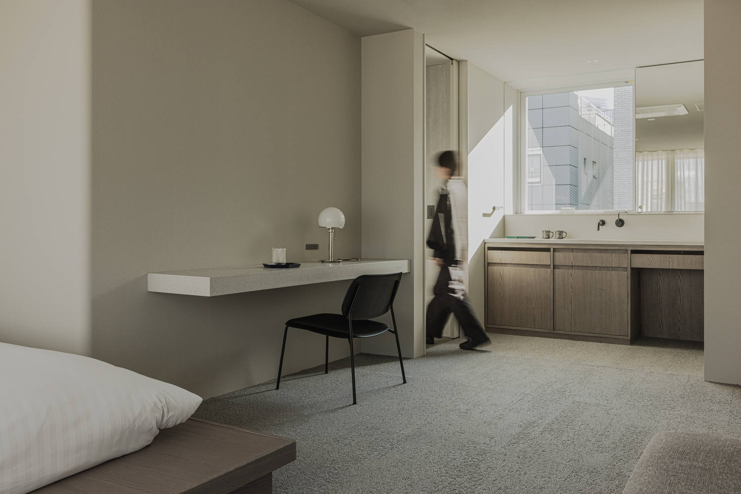 标志性的特色是一个可以欣赏到城市景色的阳台。该建筑还为客人提供了东京的独特视角,这是其他城市酒店通常无法提供的。柱和梁结构紧凑(梁深:300毫米;柱直径:150-200毫米),隐藏在墙内,以最大限度地利用自然光。客房的弧形墙壁将室内和室外空间融为一体,增强了空间的连续性。内部:无缝空间与弯曲的墙壁和硅藻土壁纸营造出柔和、漫射的光线环境。壁纸的微孔纹理和墙壁曲率增强了视觉和心理舒适度。浴室战略性地放置在远离开口的地方,以确保隐私(在中央区办公室密集的地区至关重要)。洗脸盆被重新安置在浴室外,在保持功能的同时减少了空间限制。Kooo Architects没有追求引人注目的美学,而是专注于“露台”概念来塑造酒店的形象。阳台设计的变化直接对应于房间类型,实现了平衡的混合。该项目体现了日本将空间限制转化为价值的独创性,提供了一种真实反映东京城市密度的住宿体验。