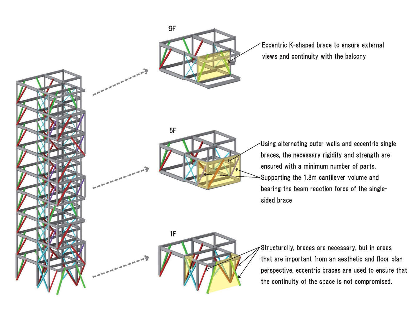 The plan grid (X1-X4) was vertically connected to optimize cost efficiency. By modifying the single-span structure at the X4-X5 axis, three distinct balcony styles were achieved, balancing functional needs with architectural expression. The terrace integrates passive design principles, enabling natural ventilation and light through Low-E glass. This balances openness with thermal comfort, mitigating summer heat and improving winter heating efficiency—a critical consideration during the COVID-19 pandemic design phase. Structure: The building's iconic form uses a steel rigid-frame structure with diagonal braces instead of conventional column-and-beam systems. This allows flexible column placement and minimizes visual obstructions on balconies. The facade has a rhythmic design, with balconies on both the left and right sides of each floor. Some balconies are triangular, while others span the entire bay. To achieve this design, we used a rigid frame structure with diagonal braces instead of the traditional column-and-beam structure. This approach allowed us to arrange the columns more flexibly, creating the desired space.