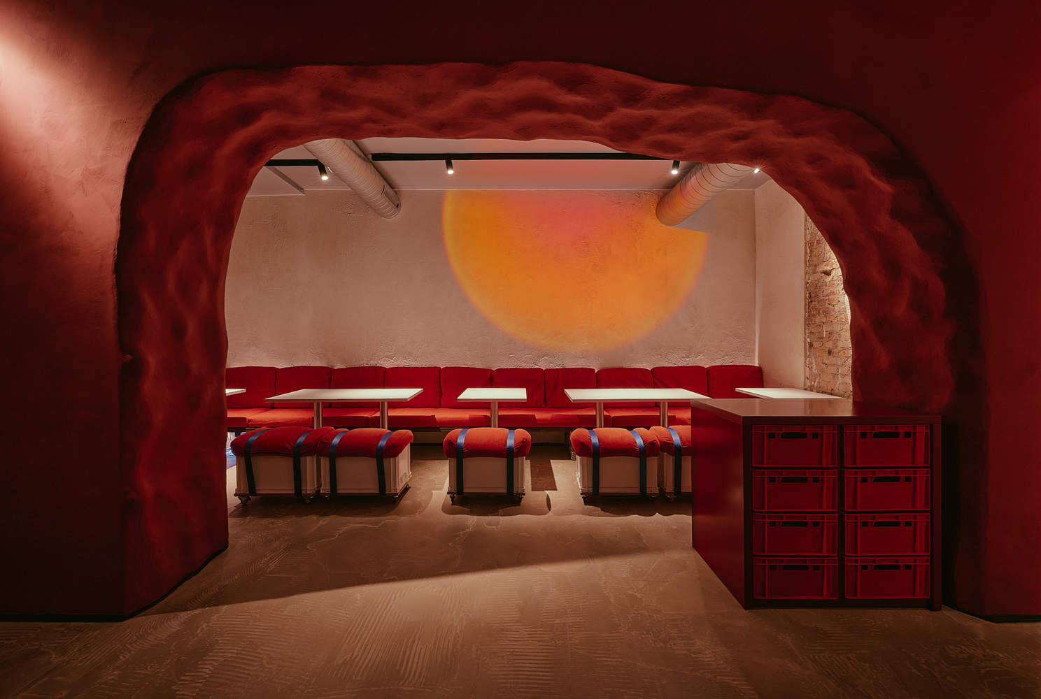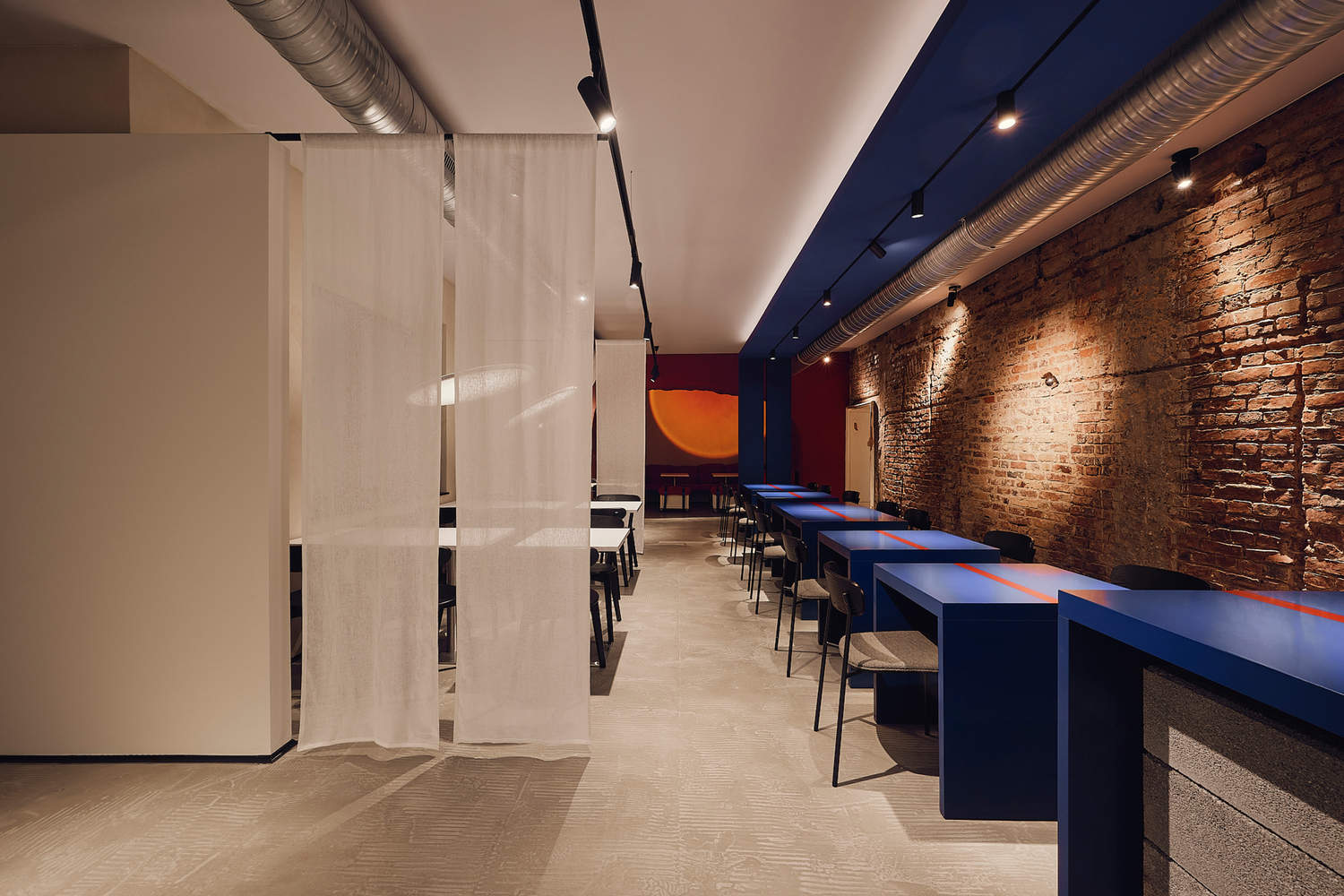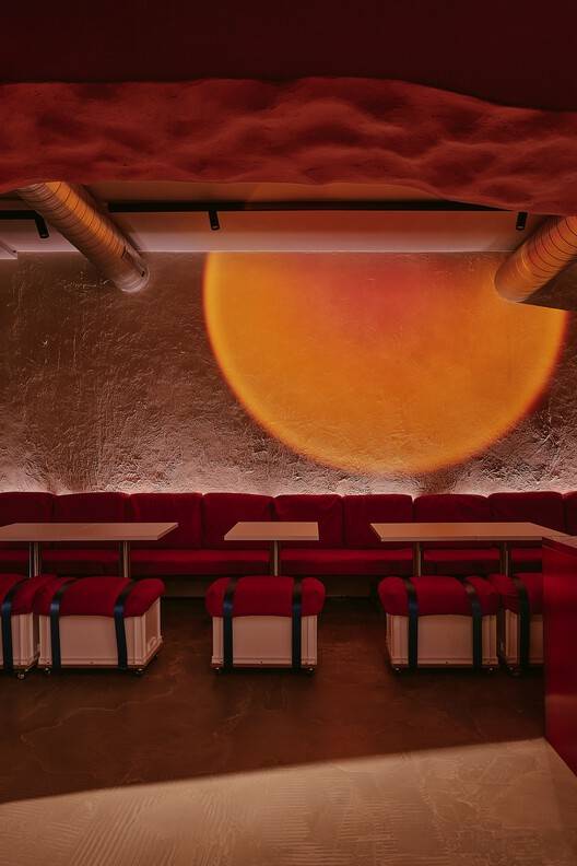 The design embraces imperfection and authenticity, reflecting the restaurant's "funky" ethos. During the renovation, historical architectural elements were preserved, such as exposed brick walls with partially removed plaster and uneven textures, adding character and a sense of timelessness. Linen screens in the dining area display projections of scenes from Samurai Champloo, immersing guests in the concept. Lighting is carefully tailored to enhance each zone's ambiance, with features like a sunset effect created with spotlights and iridescent film in the red zone.