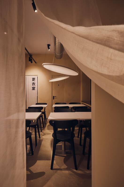 该设计融合了不完美和真实性,反映了餐厅的“时髦”精神。在翻修过程中,历史建筑元素得以保留,如部分去除灰泥的裸露砖墙和不均匀的纹理,增添了个性和永恒感。用餐区的亚麻屏幕上展示着武士尚武的场景投影,让客人沉浸在这个概念中。灯光经过精心定制,以增强每个区域的氛围,在红色区域使用聚光灯和彩虹膜创造日落效果。