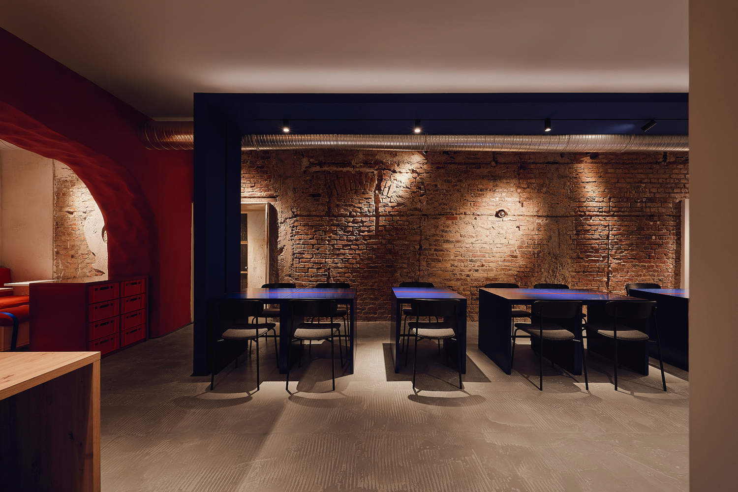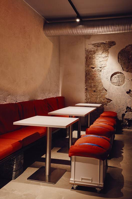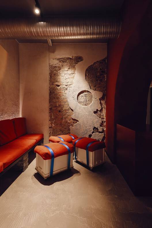 材料与细节的对比与统一:项目在材料运用上展现出极高的掌控力。一方面,设计师保留了裸露的砖墙、不均匀的纹理等历史建筑元素,赋予空间历史的厚重感和时间的沉淀;另一方面,混凝土、手工绘制的红色靠垫等材质又增添了现代感和活力。这种新旧、粗糙与精致的对比,与“时髦”的餐厅主题相呼应。此外,红线和蓝绳等细节设计,象征着不同元素之间的联系和融合,进一步深化了主题的象征意义。这种对材料和细节的精妙处理,不仅提升了空间的视觉效果,也增强了空间的文化内涵。
