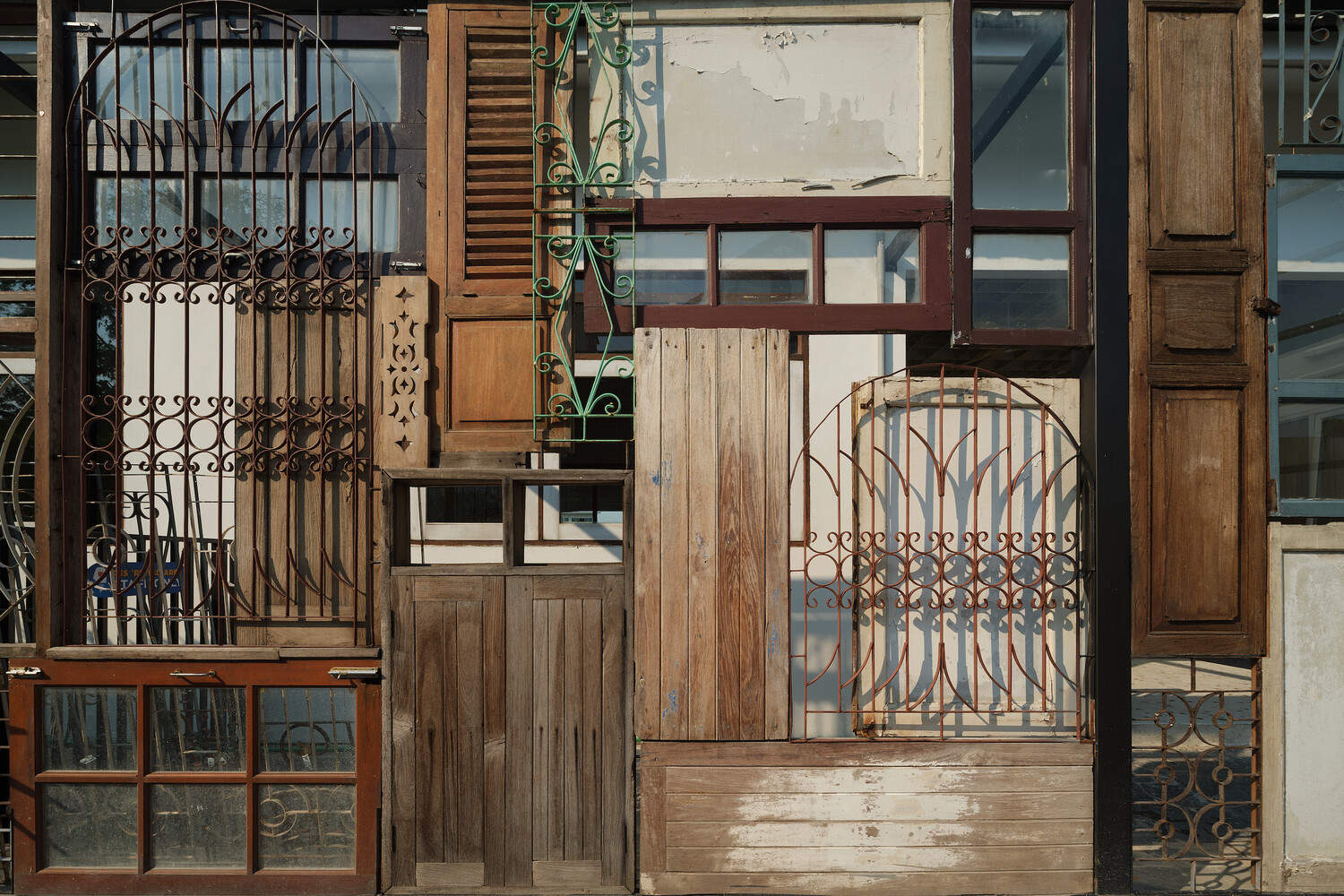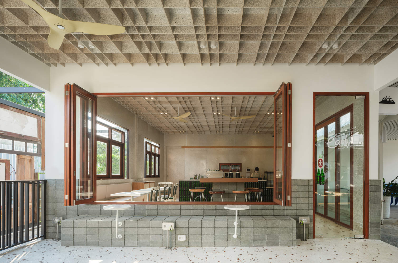 Reused – Located at the entrance of the Paw's dog park, the cafe's design extends to the dog park's gate, incorporating reclaimed windows and door frames arranged in an interlocking pattern and giving a second life as a literal threshold to welcome the guests to Early Yuyen. "Yuyen" or "Living Comfortably" when directly translated from the Thai language is reflected in the design of the cafe's interior space. The airy interior space benefits from shade cast by tall trees, offering a semi-outdoor experience when temperatures permit. As part of the reuse strategy, the operable window and the fixed window facing the exterior were salvaged from a reclaimed warehouse and incorporated as design elements. The large operable window is designed as a key feature of the cafe's facade, not only does it provide natural ventilation to the interior space, but it serves as a frame that highlights and draws attention to the cafe's interior.
