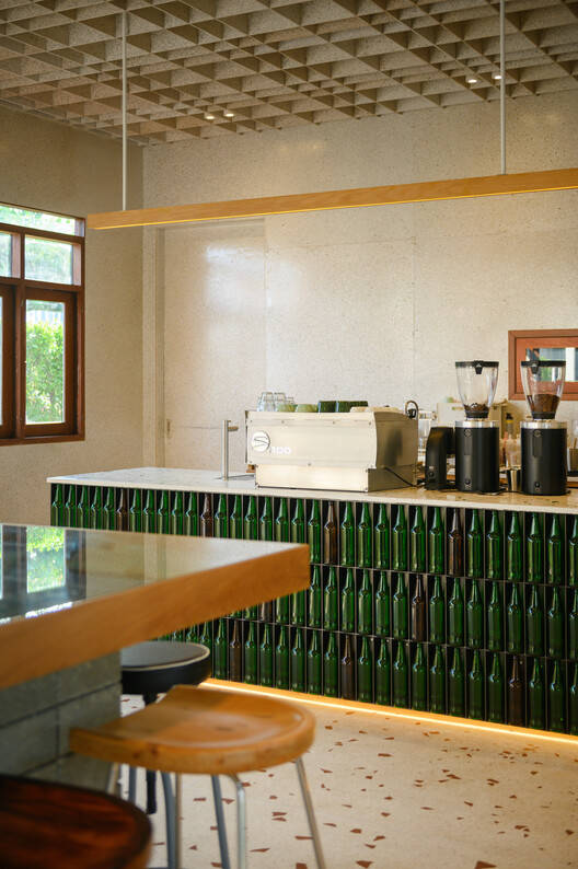 材料创新与空间体验的融合:该项目在材料运用上展现了极大的创新精神。设计师巧妙地将回收材料融入到空间设计的各个方面,例如利用回收的玻璃瓶和碎玻璃碎片制作水磨石台面,使用回收的牛奶盒制成Reboard覆层和模块化天花板,以及使用Ecobricks作为外墙装饰。这些举措不仅减少了建筑垃圾,还赋予了空间独特的视觉效果和触感。同时,设计师充分考虑了空间体验,利用高大的树木遮荫,创造半室外的开放空间,使得咖啡馆与周围环境完美融合。这种对材料创新和空间体验的兼顾,使得Early Yuyen咖啡馆不仅仅是一个饮品场所,更是一个传递环保理念、激发社区互动的场所。